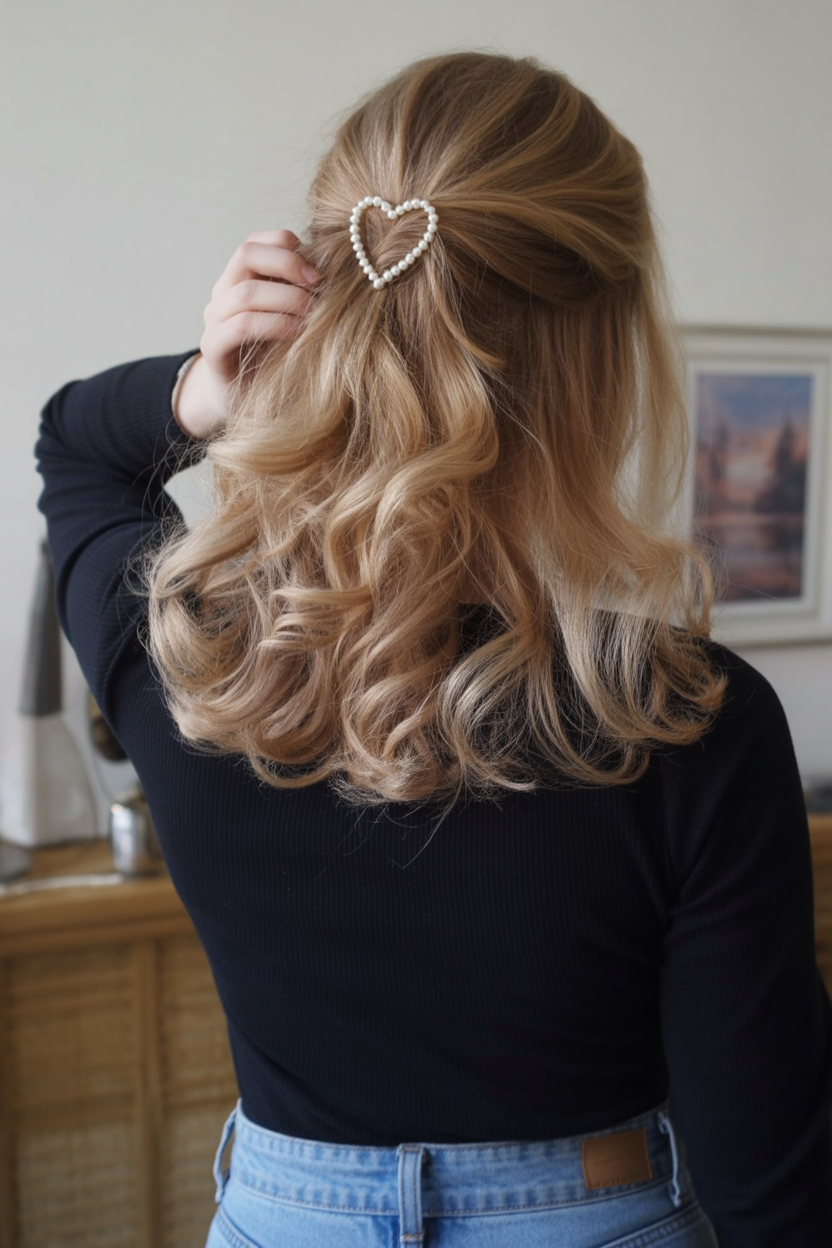 Nothing is cuter than a pearl heart clip. The hair look of this style is effortlessly romantic with its slightly wavy finish and its feminine hint of bling. It feels so special like it is the kind of detail that makes you feel special but not in an over-the-top way but in a put-together-loved sort of way.