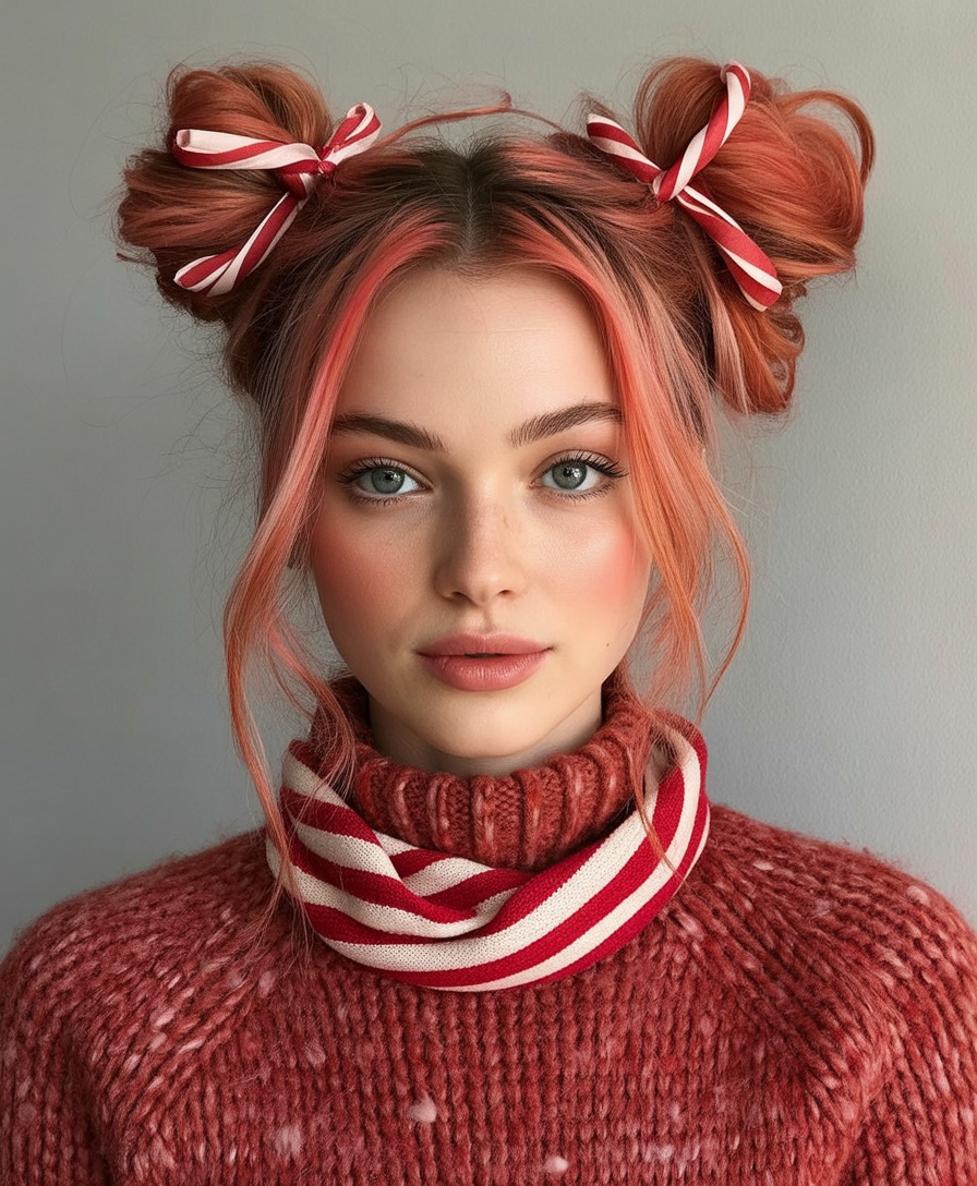 Sweet as sugar and twice as joyful, these are the heart shaped buns of love. The strip candy-cane ribbons add some fun to the style, whereas the pink hues and airy front strand make it fresh and wearable. This style is one of those hairstyles that makes you feel you have happiness on your head.