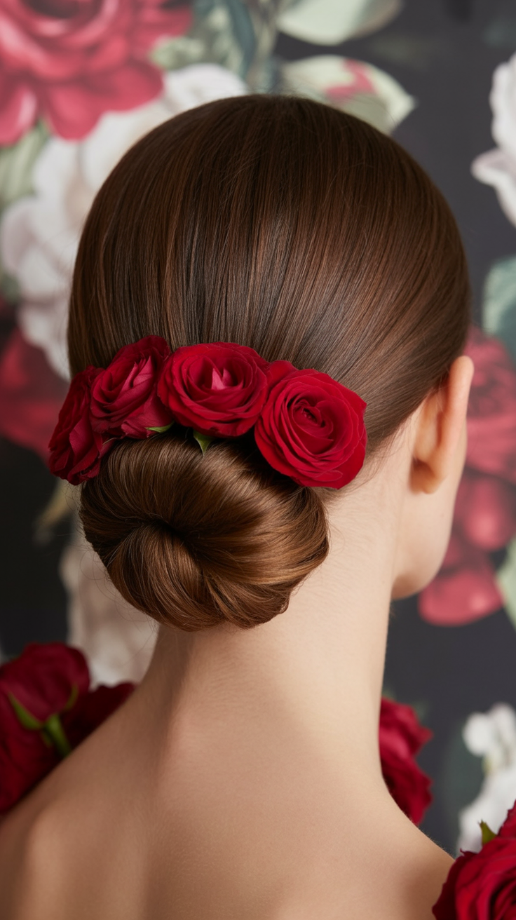 This simple bun is absolutely perfect on women with medium length to thick straight hair and an appreciation of clean polished glamour. The key to this glam look is the sleekness, so it will require a flat brush and a shine accent serum to achieve before pulling the hair back in a low ponytail and twisting into a tight knot. Add fake or real roses with subtle pins on that heart-jumping climax. It looks swell on date night, weddings, or any night you want to say to your hair: Effortless sophistication.