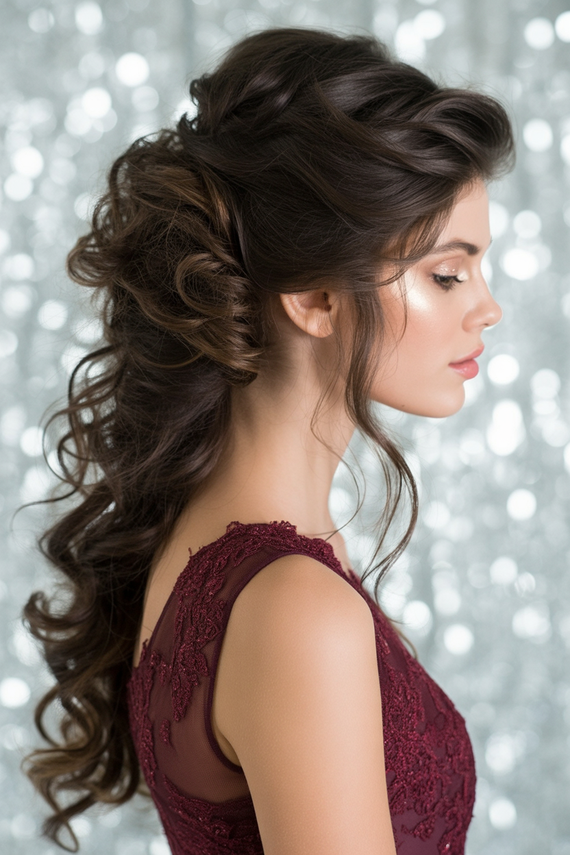 This hairstyle is pure drama—in the best way. It’s bold, voluminous, and makes no apologies. The lift at the crown gives an instant elongating effect (hello cheekbones), while the cascading curls bring that romantic, touchable texture. It makes a woman turn heads as she enters a room- and dare I say even feel like she needs to be dancing under a chandelier.