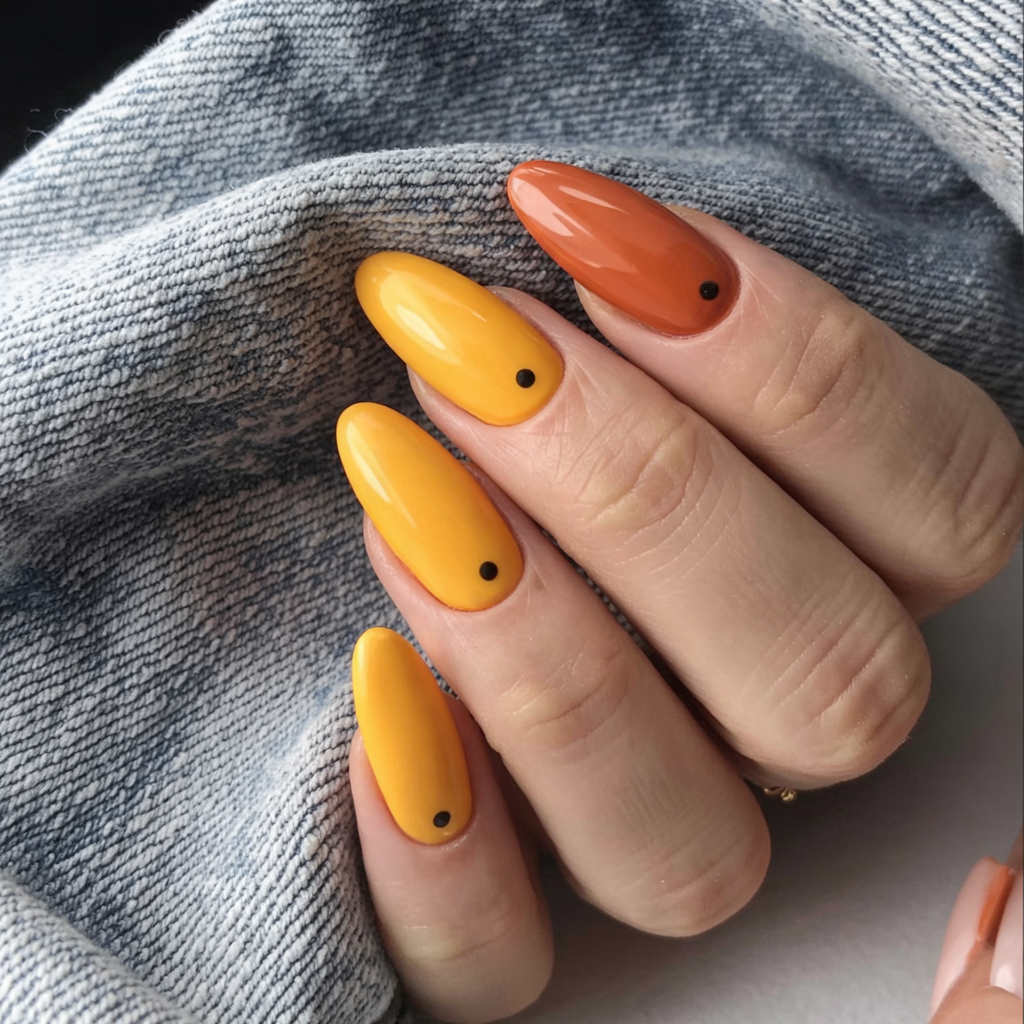 Vibrant, bright and cheerful these nails will do golden hour tough in early fall. The yellow adorning orange that is suggestive of changing leaves, and the black dots detail provide a sense of clean modern feel. They are the nails to wear on those off days that you want a pick me up.