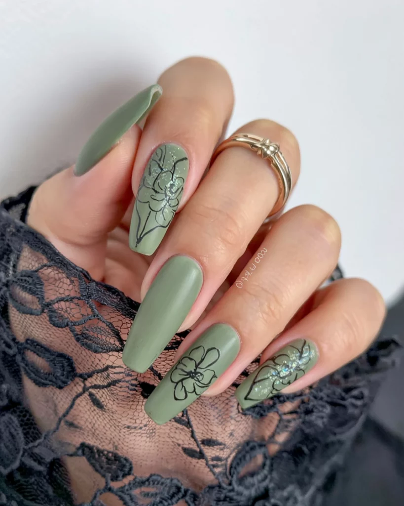 This type of botanical design in 2025 is the new trend at the moment particularly with matte finish. Works well on longer acrylic, coffin nails, anything to allow the art to breathe. Fix a matte topcoat so that smooth lush velvet lingeres in place.