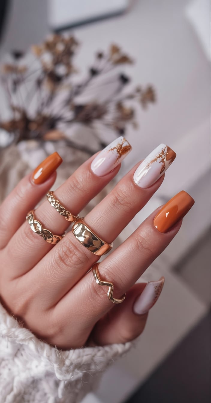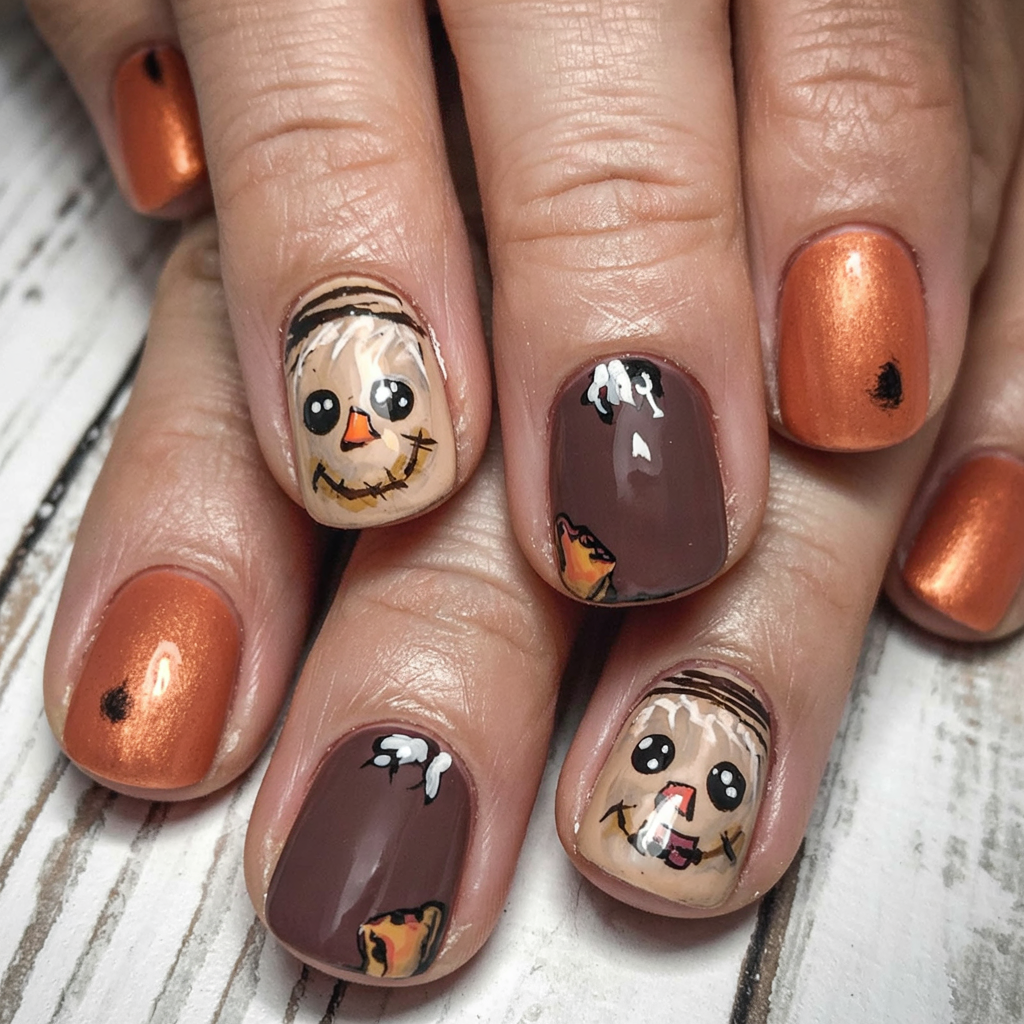 These nails remind your most-loved fall decoration in smaller size- sunny scarecrow faces, pumpkin, and cozy honey-colored cinnamon. They’re playful, nostalgic, and full of personality. Great idea when you need people smiling on seeing your hands.