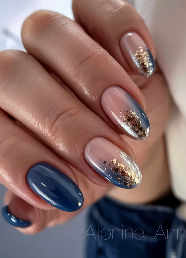The ethereal combination of navy, nude, and gold foil is stargazing even on the fall night. The fragile gradient and random glitter give nails a chic glamorous appearance, which would be flattering at night but nevertheless tender and romantic in daylight hours.