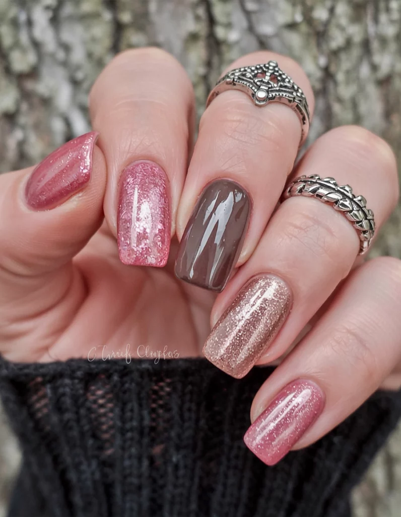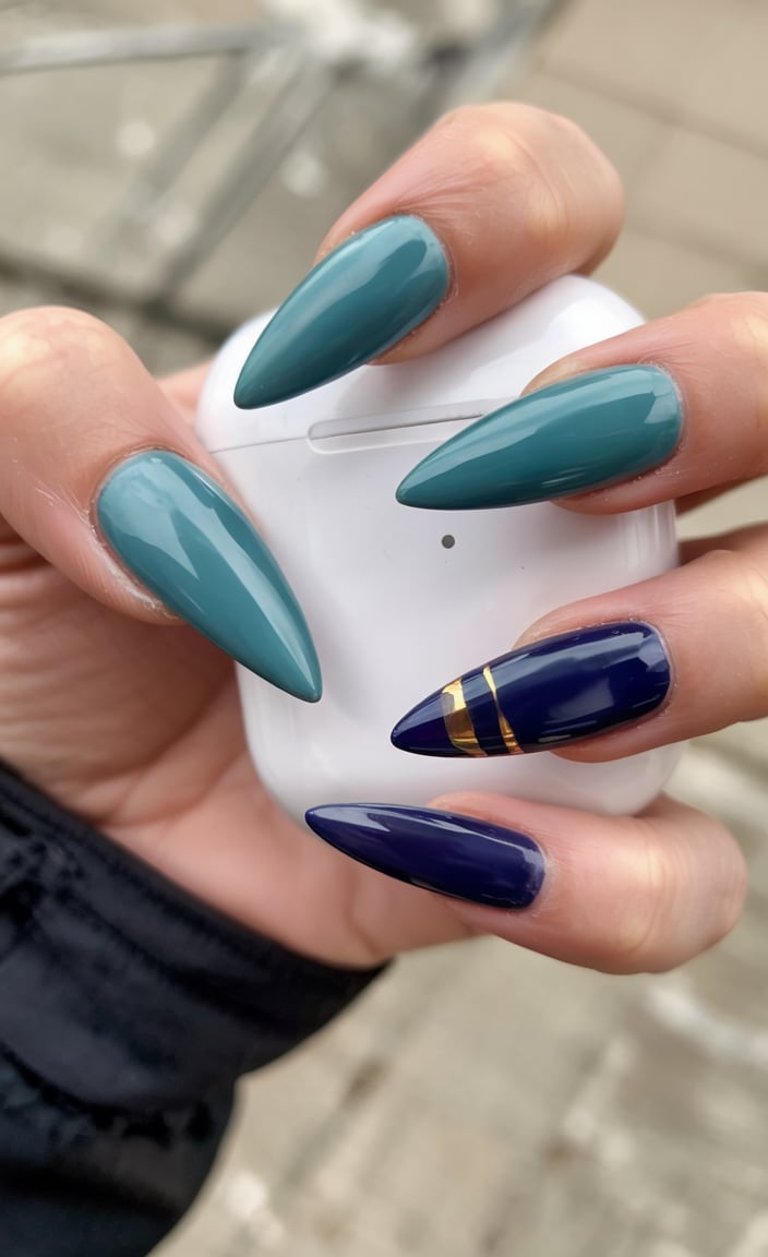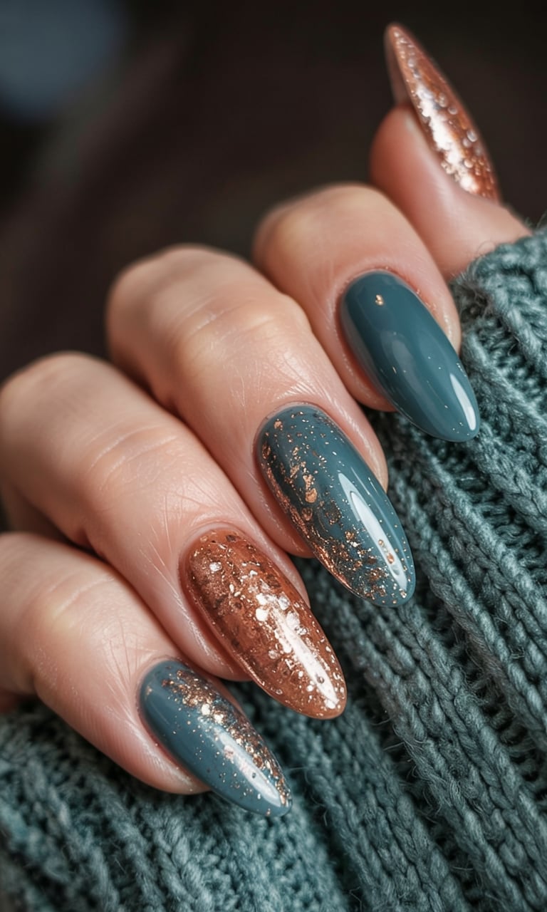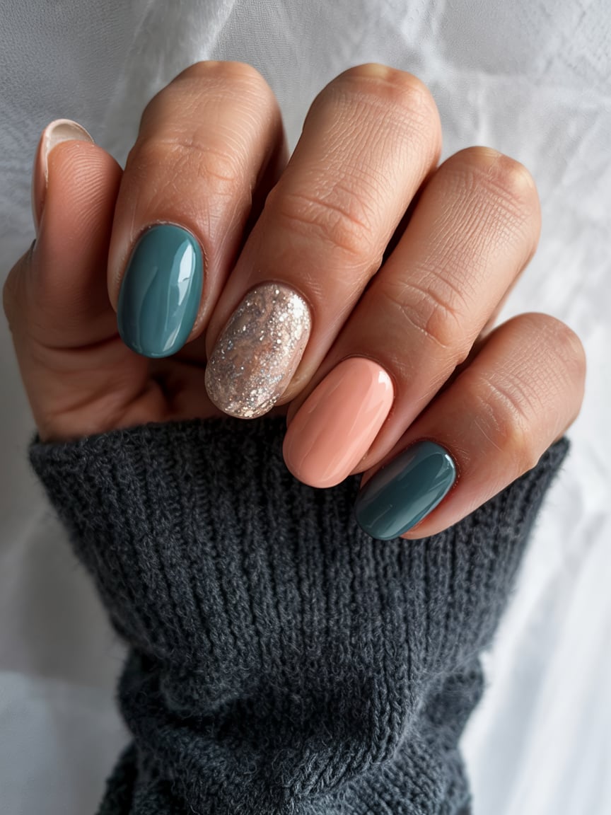 These nails are the comfort of curling in your favorite knit with some glasses of bubbly comfortable but glamorous. The combination of nice-looking slate teal and peachy nude with the add-on of a glitter bomb accent of a playful touch to the transitional weather feels. This appearance is young yet adult and classy at the same time, and it adds some sparkle to a depressing day.