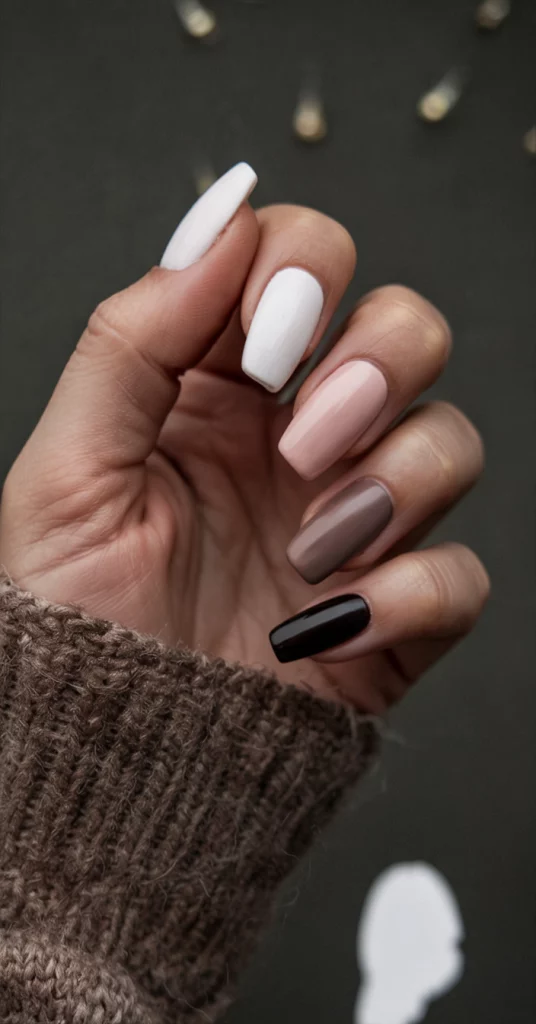 This stylish one color fade ranges between clean white to deep black with their nudes leaning on sand. It has got that editorial touch, refined, current, and surprisingly easy to wear. The ideal one to use when you want to appear polished yet do not want to be pegged on a single color.