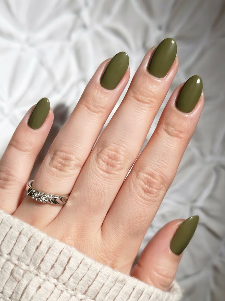 Olive green is something classic and down-to-earth: it is relaxing and grounding, like a ride through the yellow leaves. These nails are classy yet basic having clean almond shape and glossy finish.