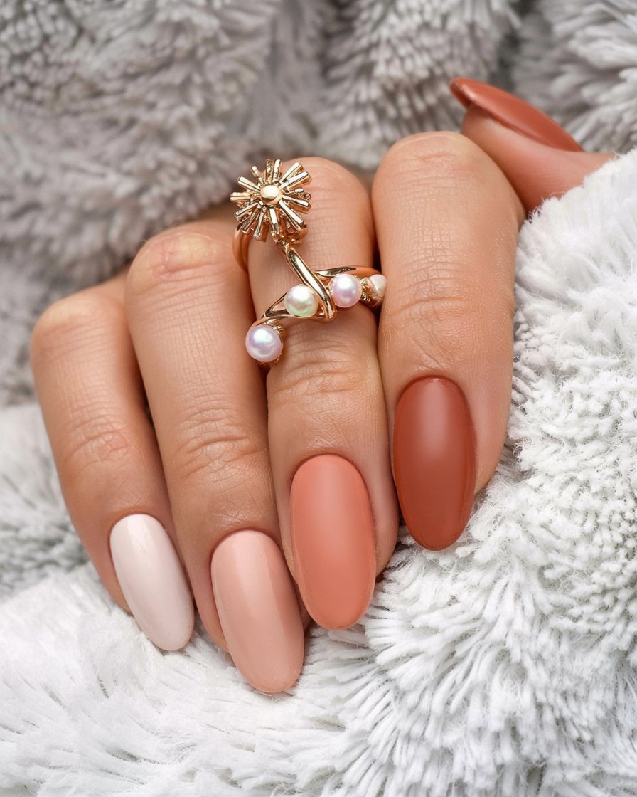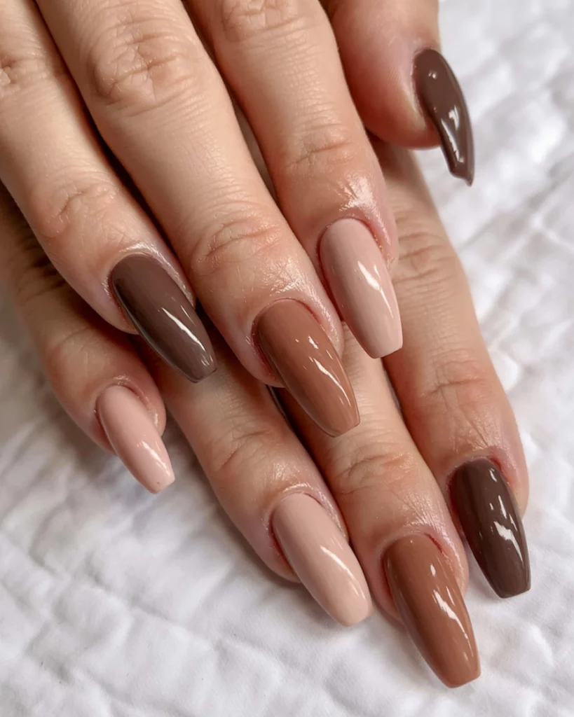 Nothing says cozy-chic quite like a latte-inspired nail palette. This warm ombr also combines the colors beige-caramel-dark mocha in one color to create a warm and cozy atmosphere, the atmosphere, where rich knitted sweaters and a mug of hot cappuccino would be a preferred choice. Quiet enough, but decadent, as though it was fall around your fingers.