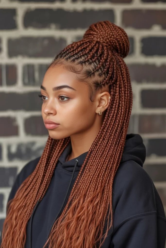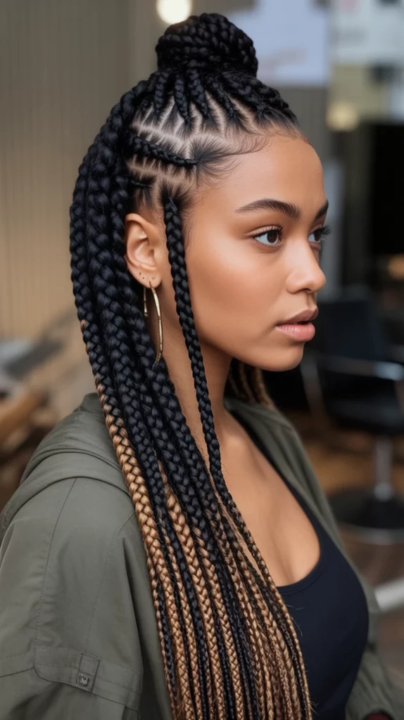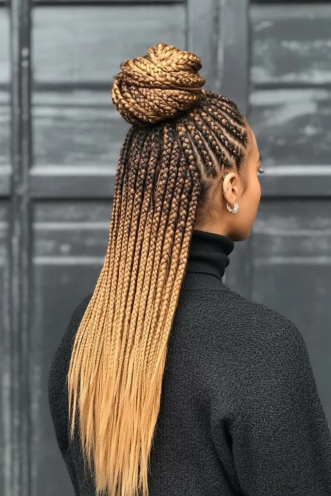 Perfect for black women colors seeking a protective look that still has movement and style. Try wrapping the top bun with some added extensions for volume, and always moisturize your scalp to keep everything healthy underneath. This is 2025 braid elegance with a twist.