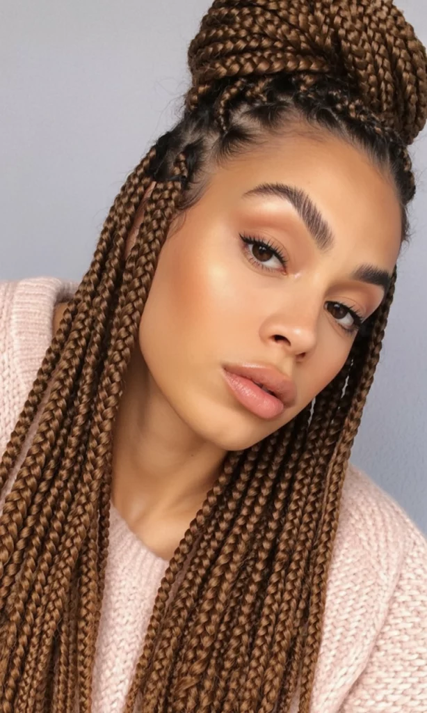 This chocolatey dream of a style is like warm cocoa on a cool fall day — smooth, rich, and totally comforting. The braids are neat and uniform, pulled up into a soft bun that flatters the face and elevates the whole look with minimal effort.