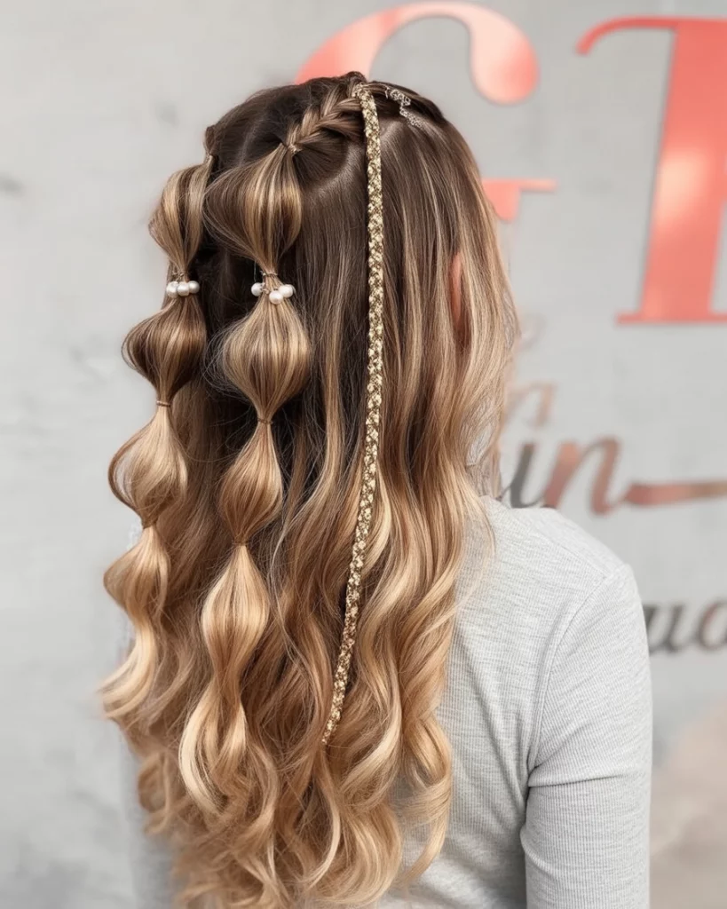 This style feels like it floated in straight from a fairytale. With loose, voluminous bubble braids and cascading waves, the pearl accents and golden thread give it an elevated, almost ethereal charm. It’s romantic, delicate, and just a little whimsical.