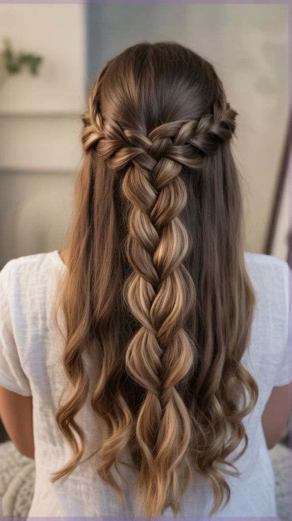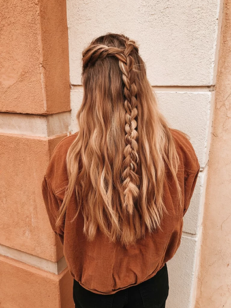 Soft, cascading, and a little bit storybook — this half-up braid is everything romantic. The braid frames the head like a halo while letting the waves underneath tumble freely. It’s giving candlelight dinners and cozy knit sweaters with a hint of magic.