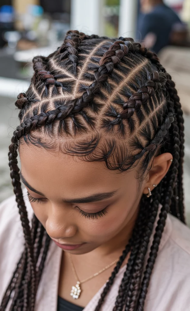 If you’re a lover of geometry and elegance, this one’s for you. Works best on black women 2025 who want something protective but artistic. Keep it looking sharp with edge control gel and a fine-tooth brush. You’re basically a walking Inspo board.