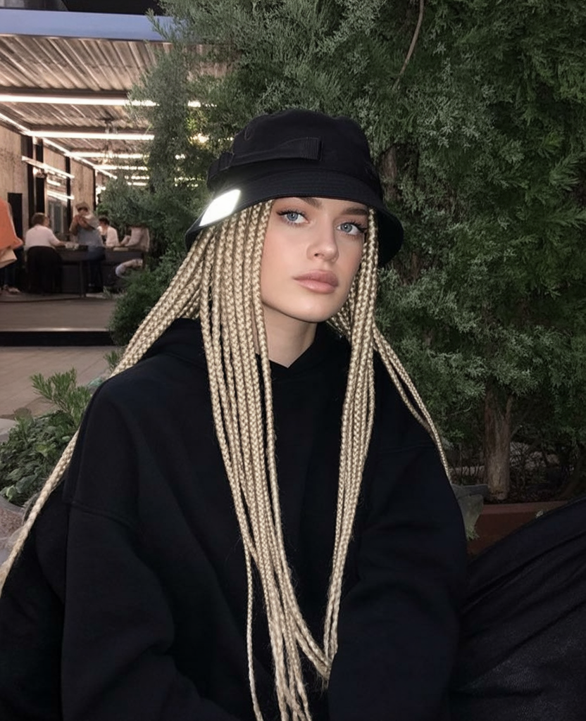 Edgy, urban, and absolutely unapologetic — these ice blonde braids scream individuality and high-low fashion confidence. Paired with a black hoodie and bucket hat, the vibe is cool-girl meets 90s streetwear revival. This is the kind of braid look that turns sidewalks into runways.