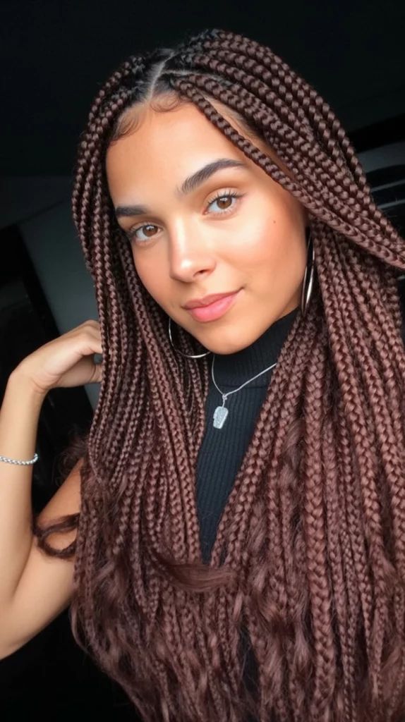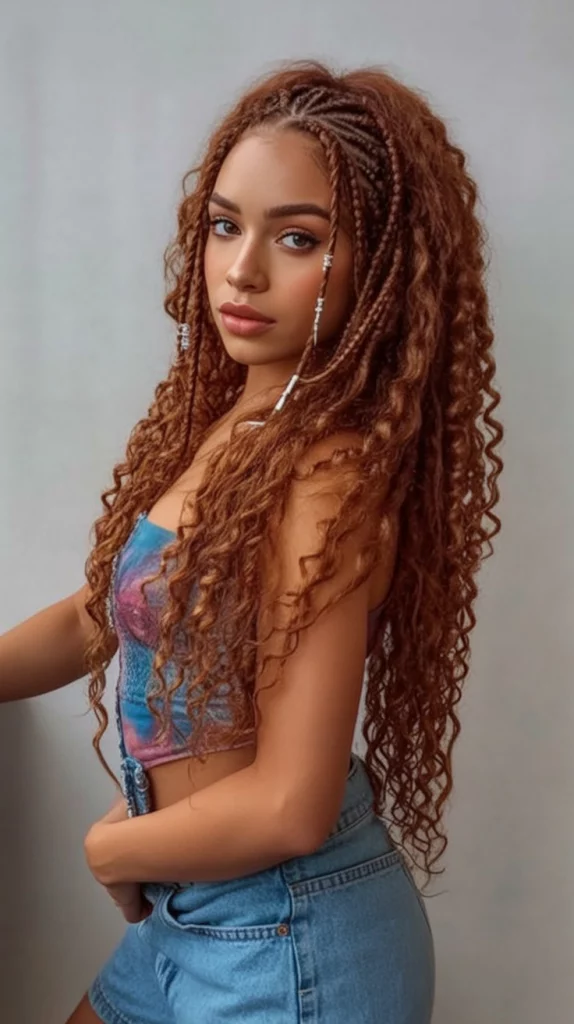 There’s something wildly romantic and earthy about this mix of free-flowing waves and petite, polished knotless braids. The texture contrast gives it a relaxed, soulful vibe — like someone who’s always jetting off to music festivals or weekend road trips. The soft, rich auburn color adds an autumnal warmth that feels perfect for those crisp 2025 fall mornings.