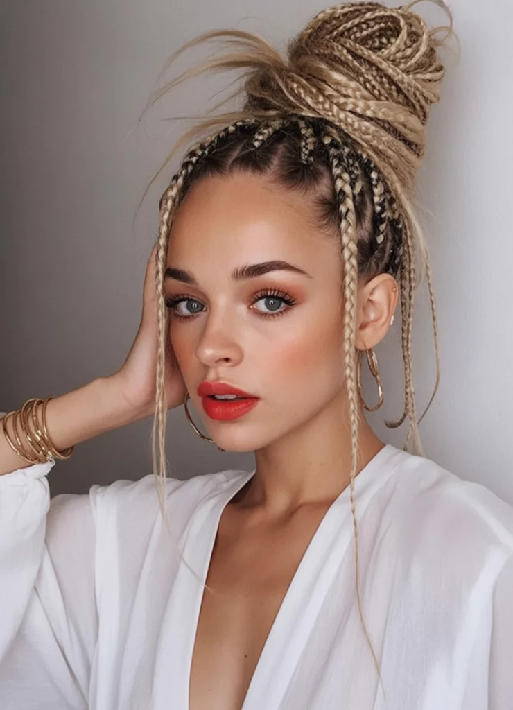 This style works well for lighter skin tones and straight to relaxed textures. It’s a great way to keep braids off your neck while still turning heads. Use edge control to smooth the base and keep a few braids loose around the face for that chic, undone vibe.