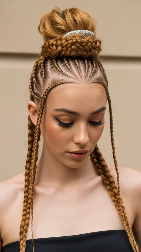 Talk about a crown moment — this golden-toned braided bun is practically royal. The top knot is wrapped with its own braid like a built-in headband, and that silver accent? Just the right amount of sparkle. It’s elegant, editorial, and a little bit extra (in the best way).