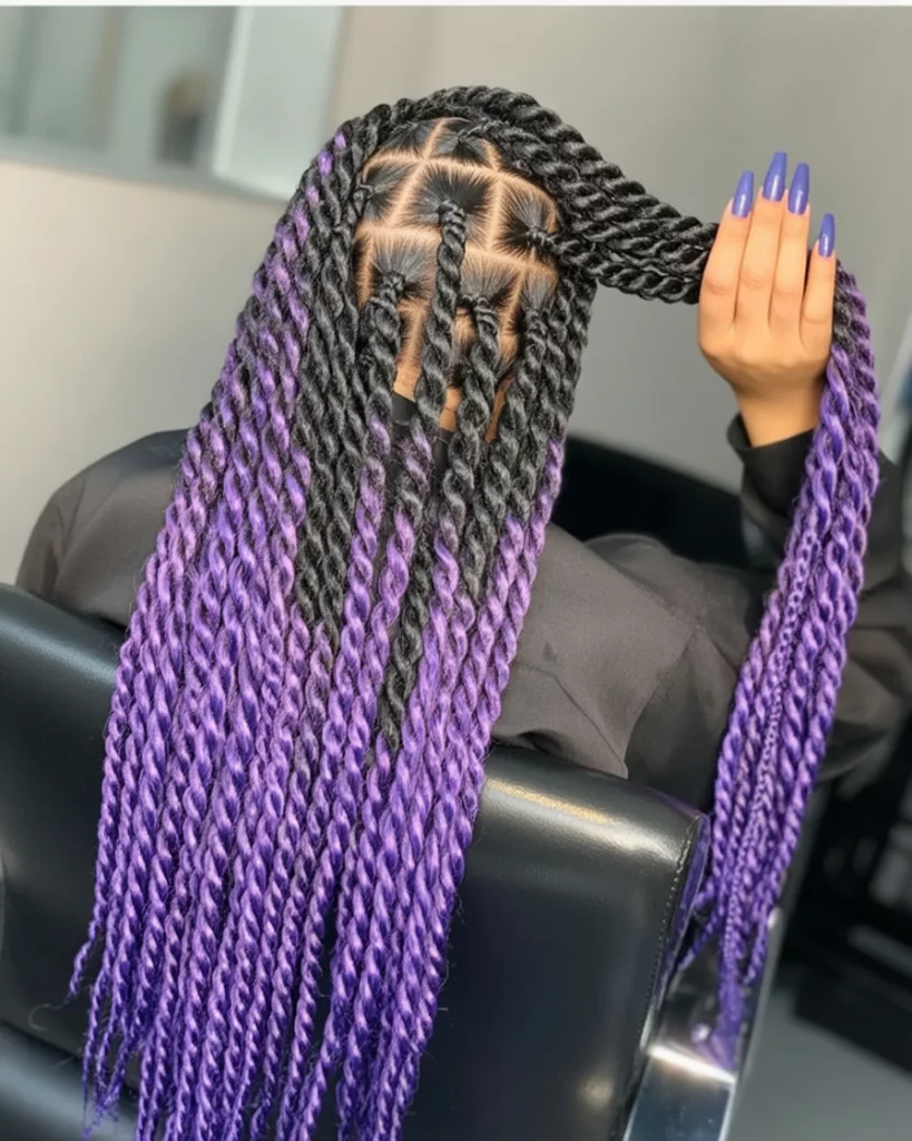 This look is especially flattering for black women who want to explore bold colors without sacrificing styles that protect their natural texture. The twists are ideal for thick, coily hair and hold up beautifully in cooler weather. Add mousse to reduce frizz, and if you’re feeling extra, a splash of hair gloss will really make that purple pop. It’s a 2025 inspo moment just waiting to happen.