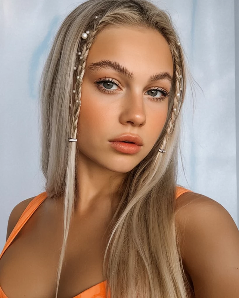 If you’re looking for something dainty but striking, these face-framing mini braids are it. Dotted with pearls and finished with metallic accents, they bring major 2025 inspo for soft glam. Whether it’s brunch or date night, this style makes a statement.