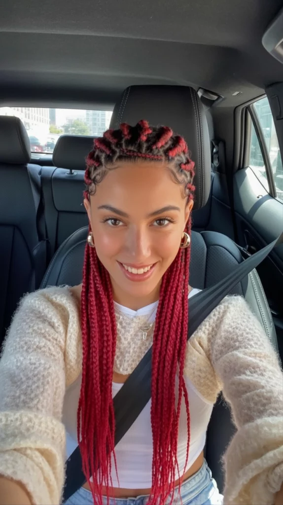 Bold, unapologetic, and bursting with confidence — this cherry red braided look is for the woman who walks into a room and owns it. The color is electric, the braids are sleek, and the overall effect is youthful yet daring. This look says “I don’t just follow trends — I create them.”