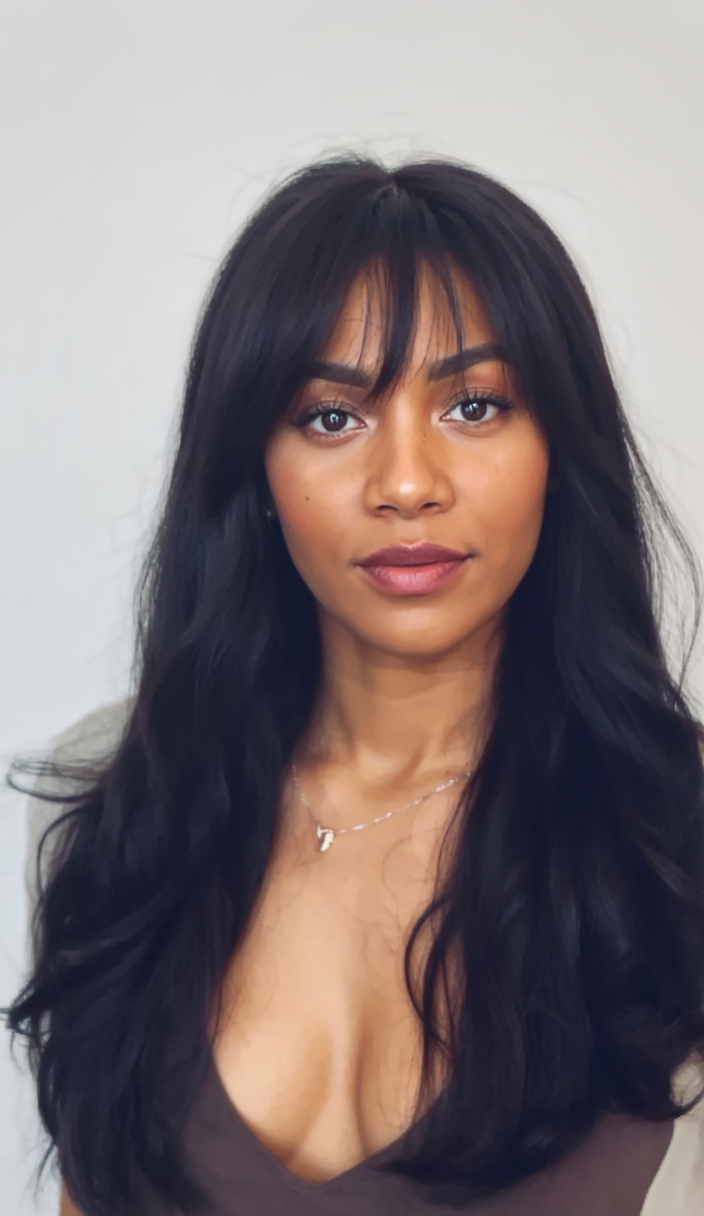 Nothing refreshes your look quite like adding wispy bangs to long, soft layers. The texture here is subtle and romantic, while the bangs frame the eyes so beautifully. It’s giving that “mysterious allure” energy that’s perfect for crisp fall days.