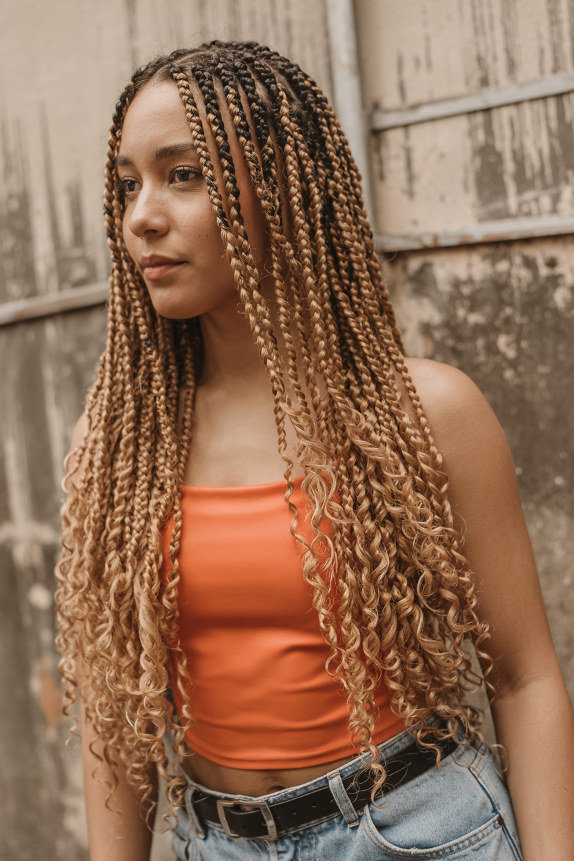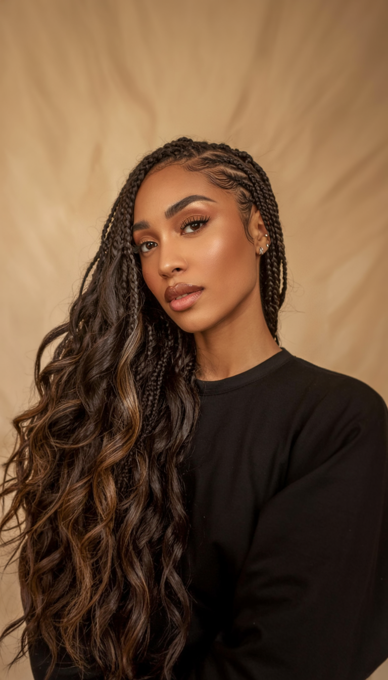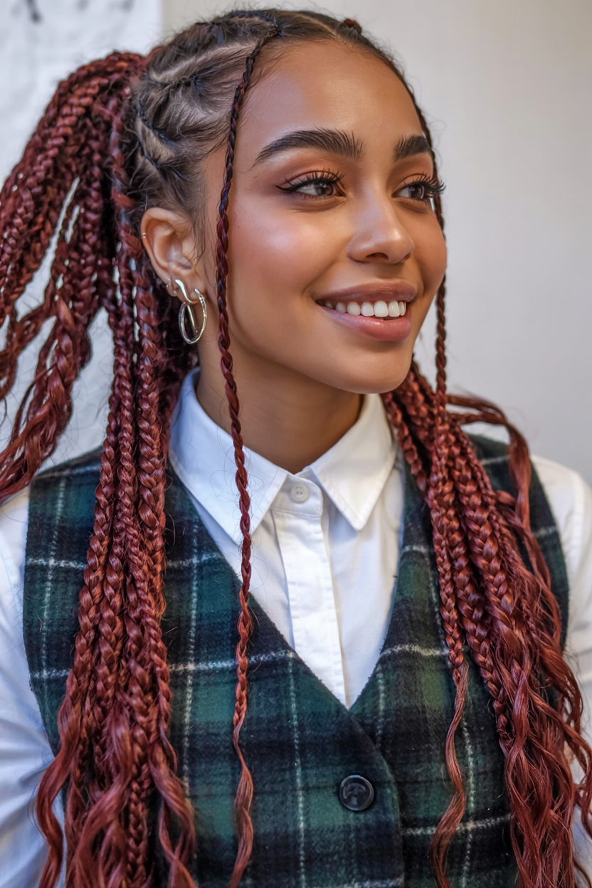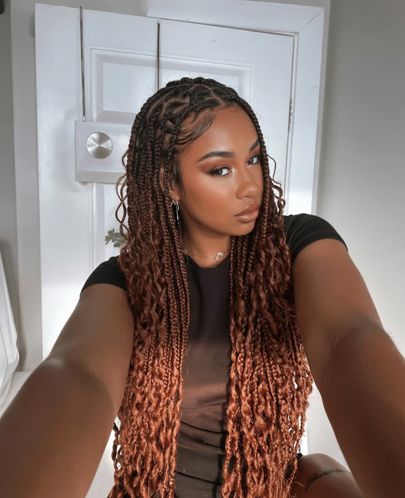 These rich cinnamon box braids with cascading curls are an instant fall favorite. The color brings warmth and richness, while the loose curls soften the style — perfect for adding a little seasonal spice to your look.
