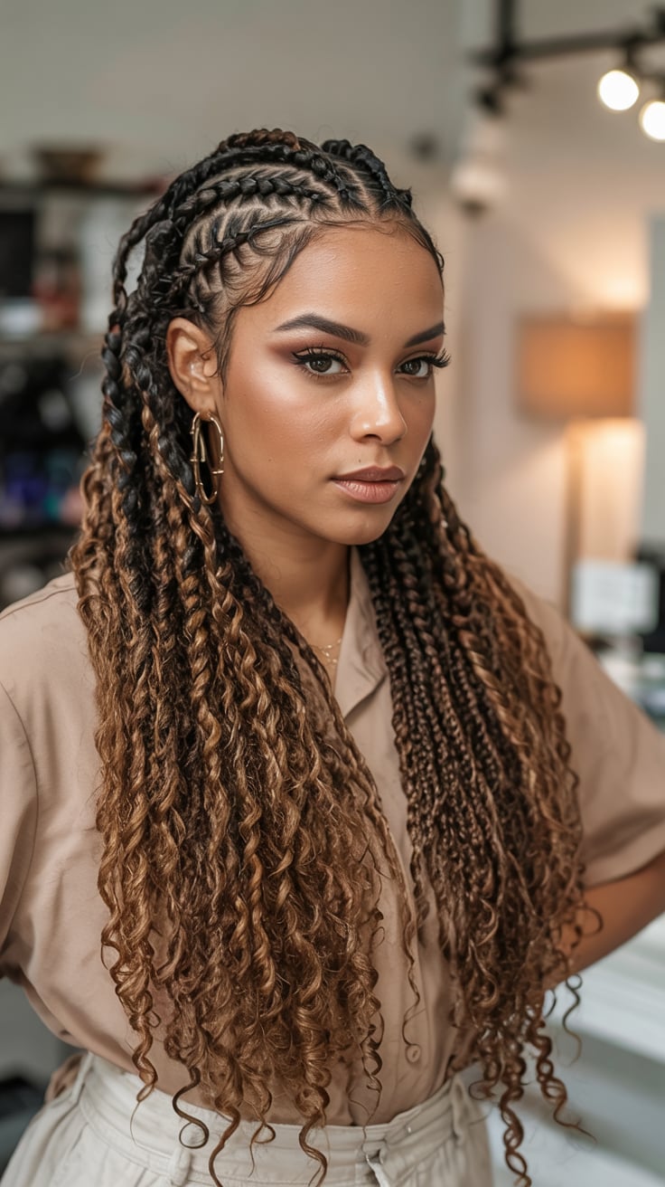 Why choose between braids and curls when you can have both? This cornrow and twist combo with cascading caramel curls is playful, trendy, and full of personality — perfect for keeping your look fresh as the seasons change.