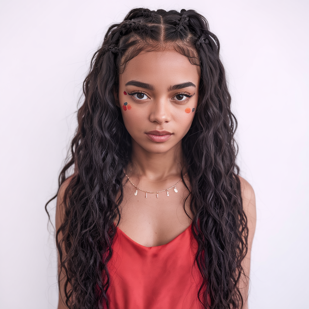 Perfect for anyone looking for a protective yet show-stopping look. The braids anchor the style, keeping the scalp neat, while the flowing waves let you play with length. Pair it with statement earrings for an extra dash of glam.