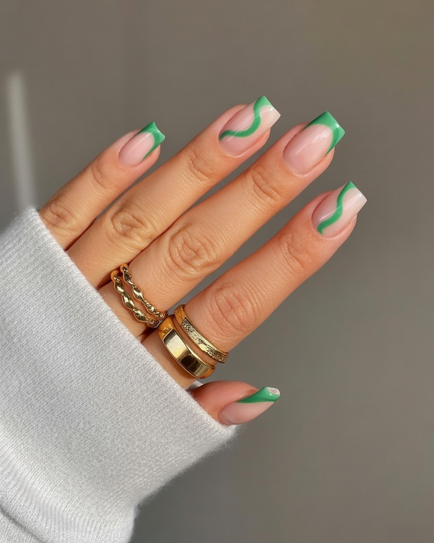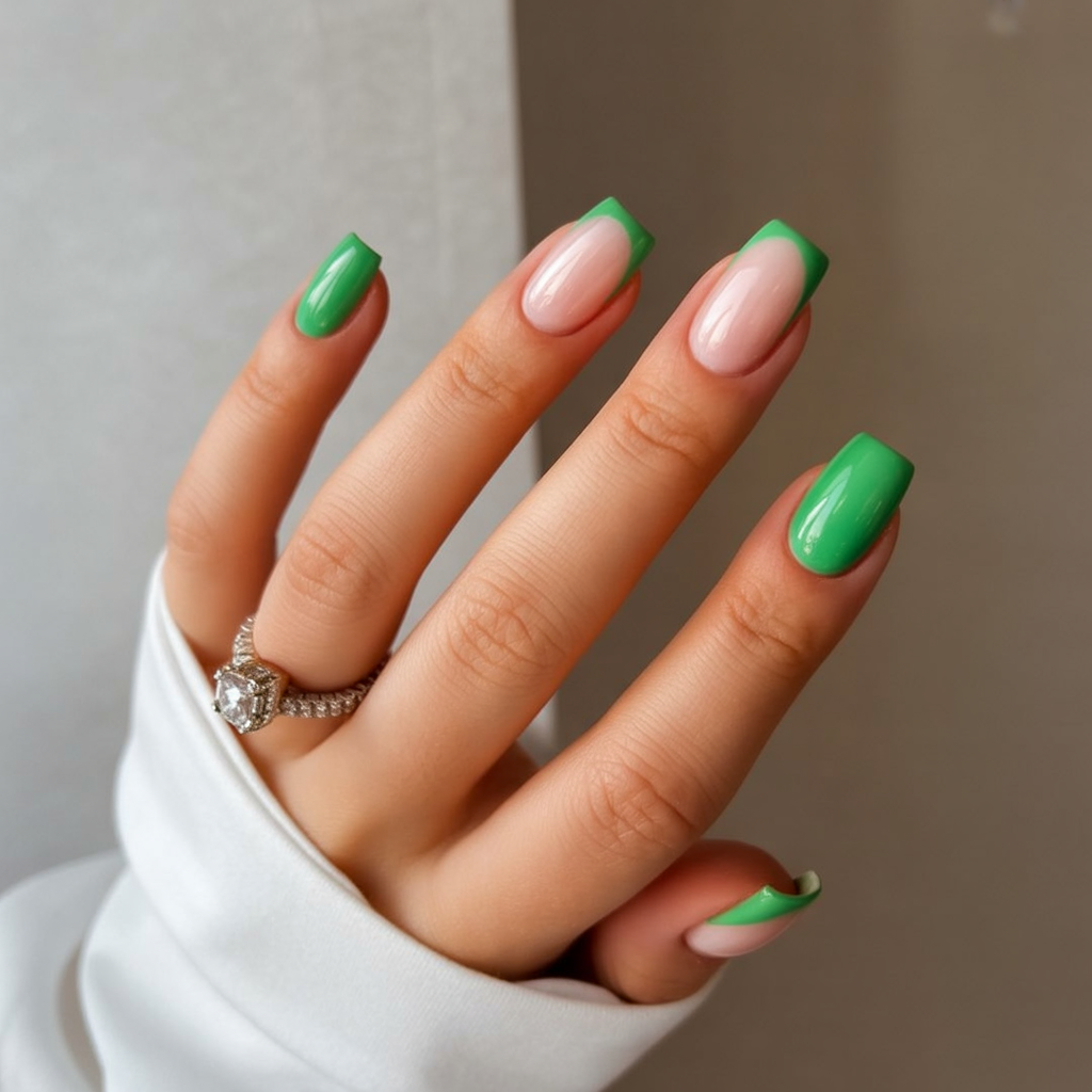 There’s something instantly uplifting about this look—it feels crisp, confident, and quietly joyful. The soft nude base keeps things elegant, while the bright green tips add just enough personality to feel modern without being loud. It reminds me of that first warm day in spring when you swap your coat for a lighter jacket and suddenly feel ten years younger. Clean, polished, but with a playful wink.