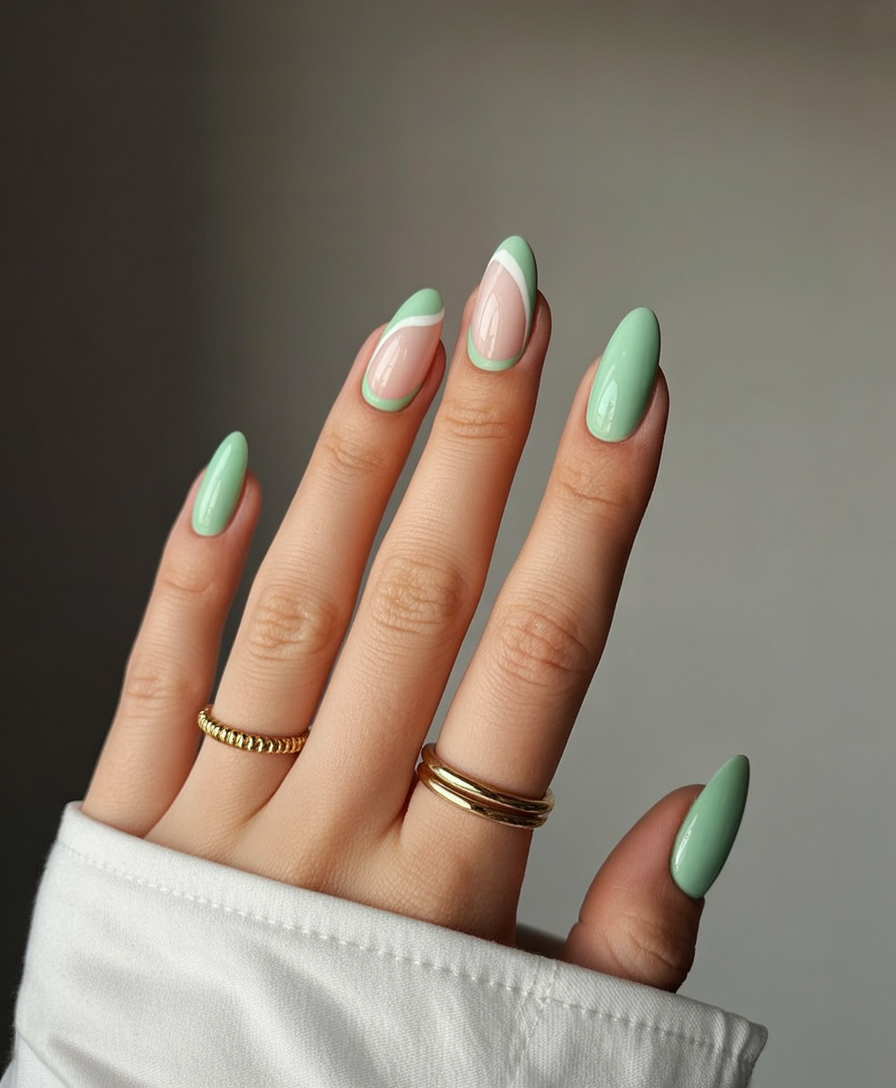 This manicure feels effortlessly put-together, like slipping into your favorite white sweater and instantly feeling calm and polished. The gentle green wave adds movement without overpowering the natural base, giving the nails a relaxed elegance that feels grown-up and modern at the same time. It’s the kind of look that doesn’t beg for attention but still quietly stands out.