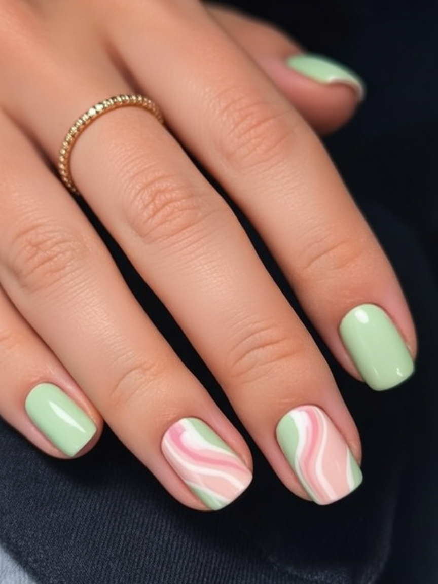 These nails feel like spring in motion—soft, cheerful, and a little bit dreamy. The gentle swirl of pastel green and pink and white brings a playful softness that feels youthful without trying too hard. It’s the kind of manicure that makes you smile every time you catch it in the light.