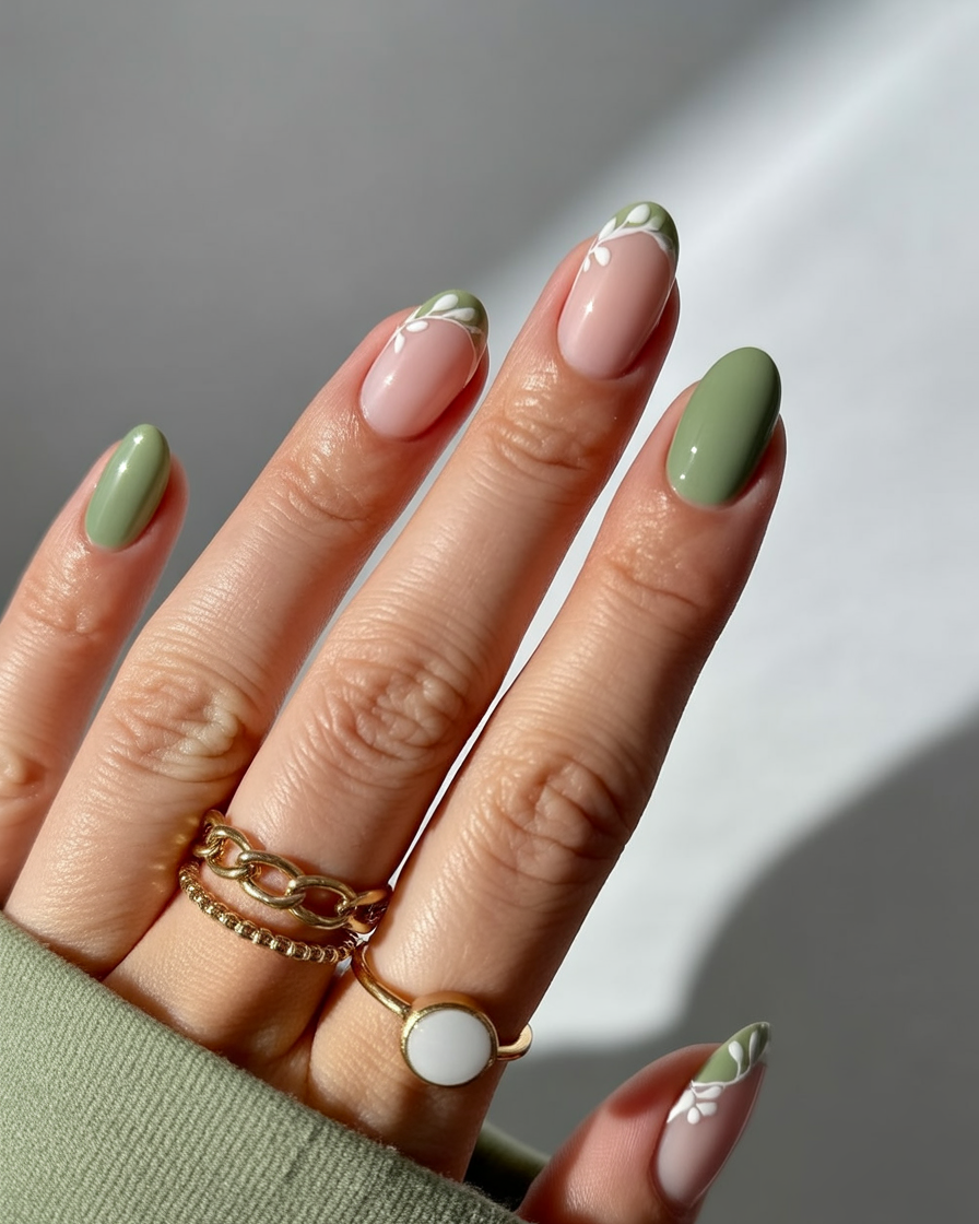 There’s something quietly romantic about this look. The muted olive tone feels earthy and grounded, while the tiny flowers add a gentle, almost nostalgic charm. It’s soft without being sweet, elegant without feeling formal—perfect for those spring days when you want your nails to feel special but not showy.