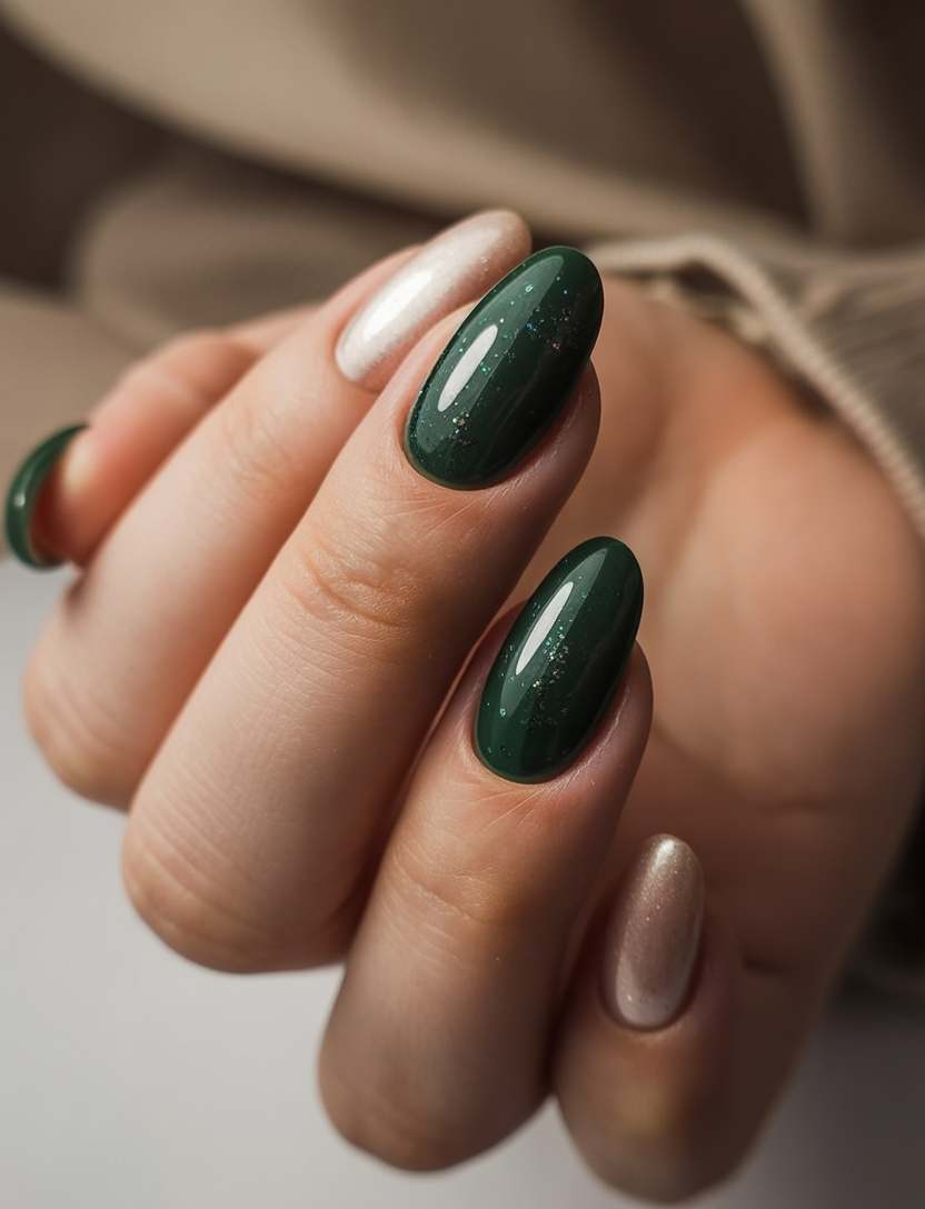 If you’re drawn to deeper shades but still want something spring-appropriate, this is a beautiful option. Almond shapes really shine here, and the contrast between the nude base and dark green keeps the look balanced. It’s ideal for anyone who loves timeless ideas with a modern edge.