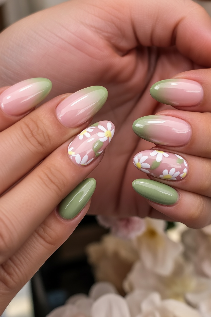 These nails feel like a breath of fresh air. The soft sage tones blended with blush pink create a soothing, feminine palette, while the tiny flowers bring a joyful springtime touch. It’s gentle, cheerful, and incredibly flattering—one of those designs that feels instantly uplifting.