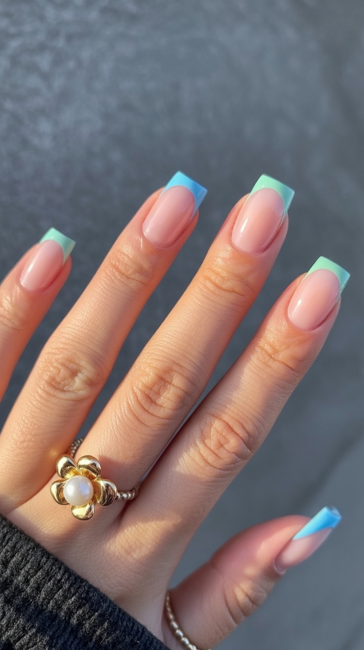 There’s a crisp, refreshing energy to this manicure that feels instantly modern. The blue and mint tips add a cool contrast to the natural base, creating a look that’s clean, confident, and surprisingly versatile. It’s playful without being loud—perfect for spring but polished enough for everyday life.