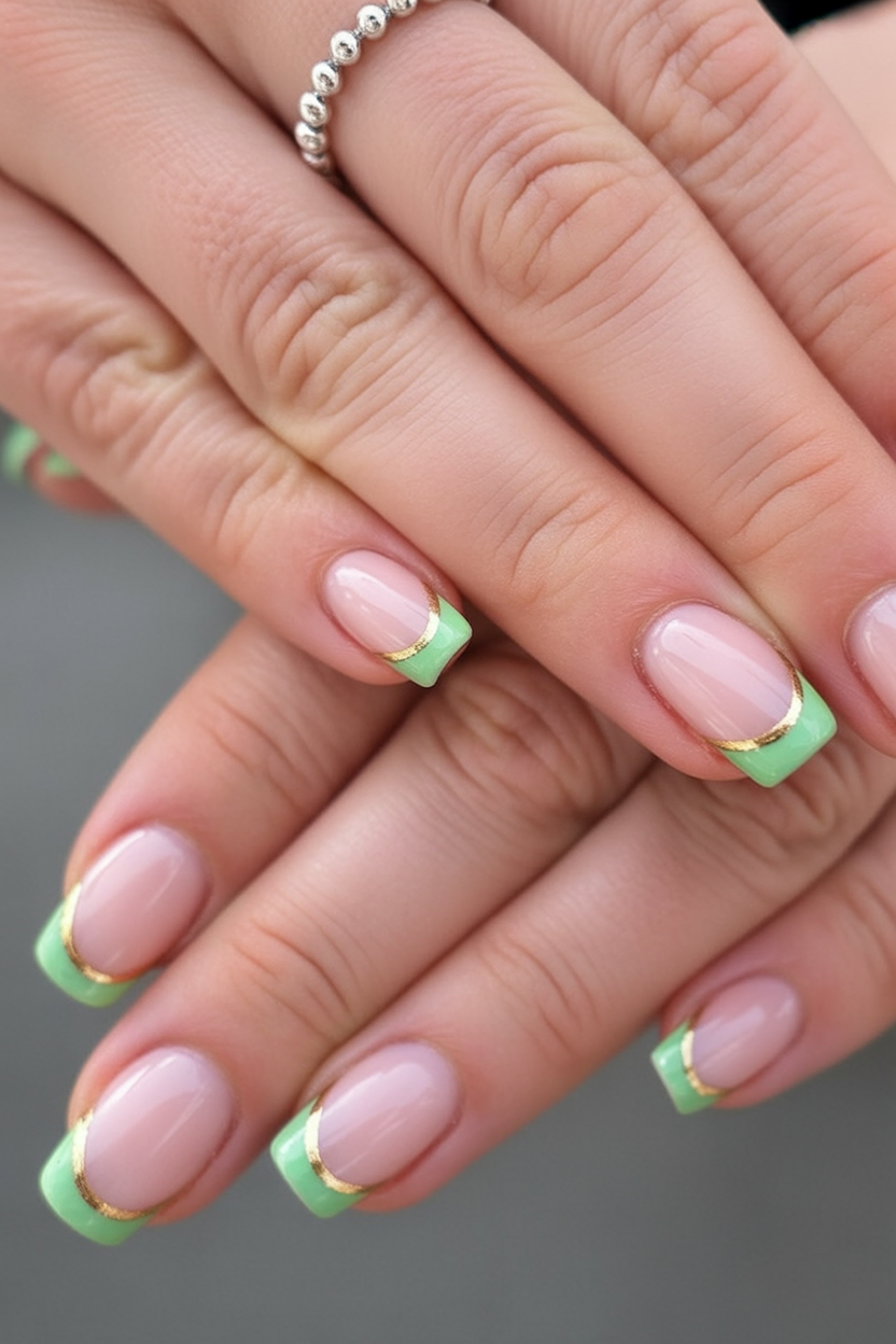 This manicure feels refined and quietly luxurious. The soft mint tips are clean and fresh, while the thin gold edge adds just enough shine to feel special. It’s elegant in a very wearable way—like understated jewelry that catches the light when you move your hands.