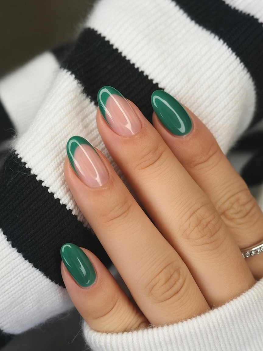 This manicure has a confident, stylish vibe that feels both modern and timeless. The deep green tips add richness, while the glossy finish keeps everything looking smooth and refined. It’s bold enough to stand out, yet classic enough to wear anywhere.