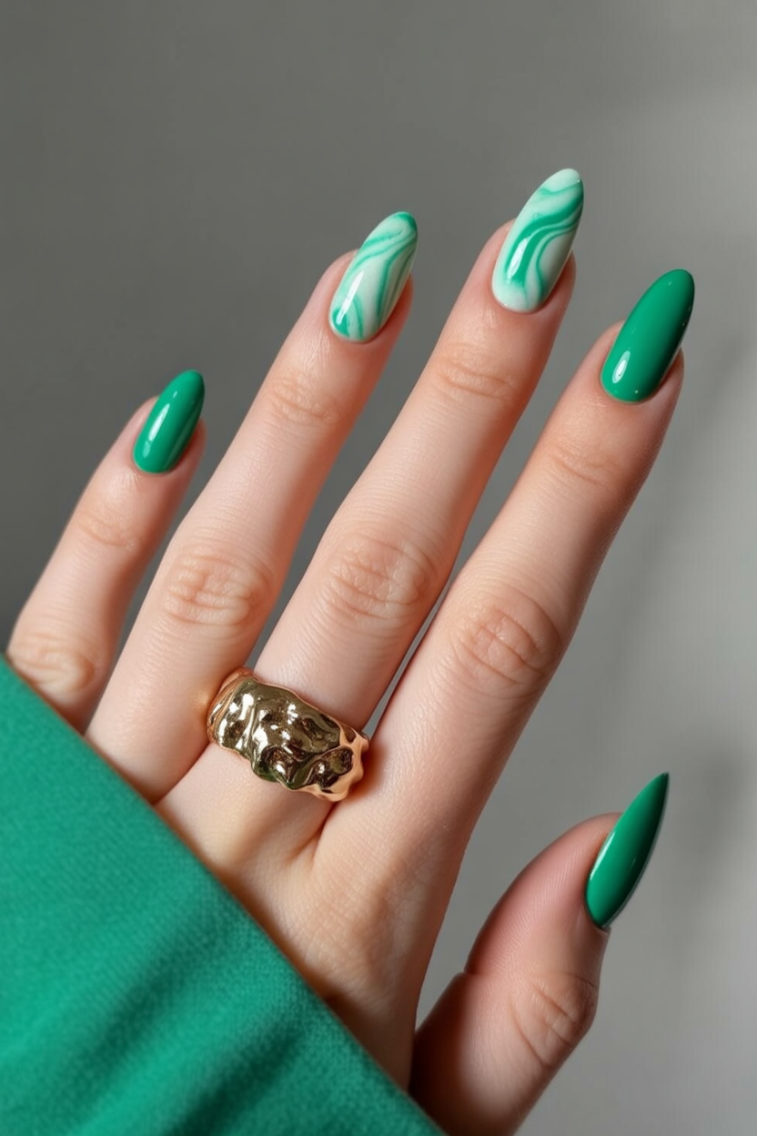 19. Emerald Swirl Almond Nails with Artistic Flow