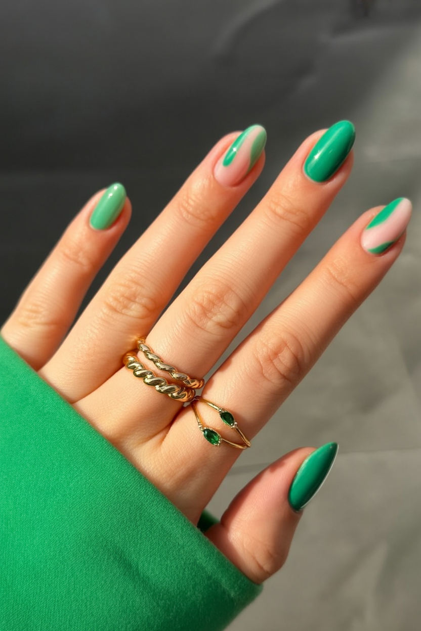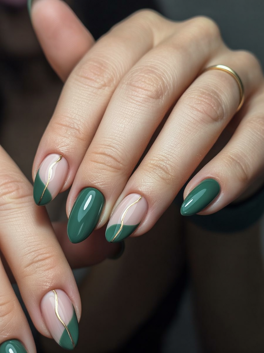 This look has movement—it feels dynamic, confident, and just a little bit daring. The diagonal sweep of green over a natural base gives these nails a fashion-forward feel, like a tailored blazer with an unexpected lining. It’s fresh, stylish, and subtly bold without crossing into flashy territory.