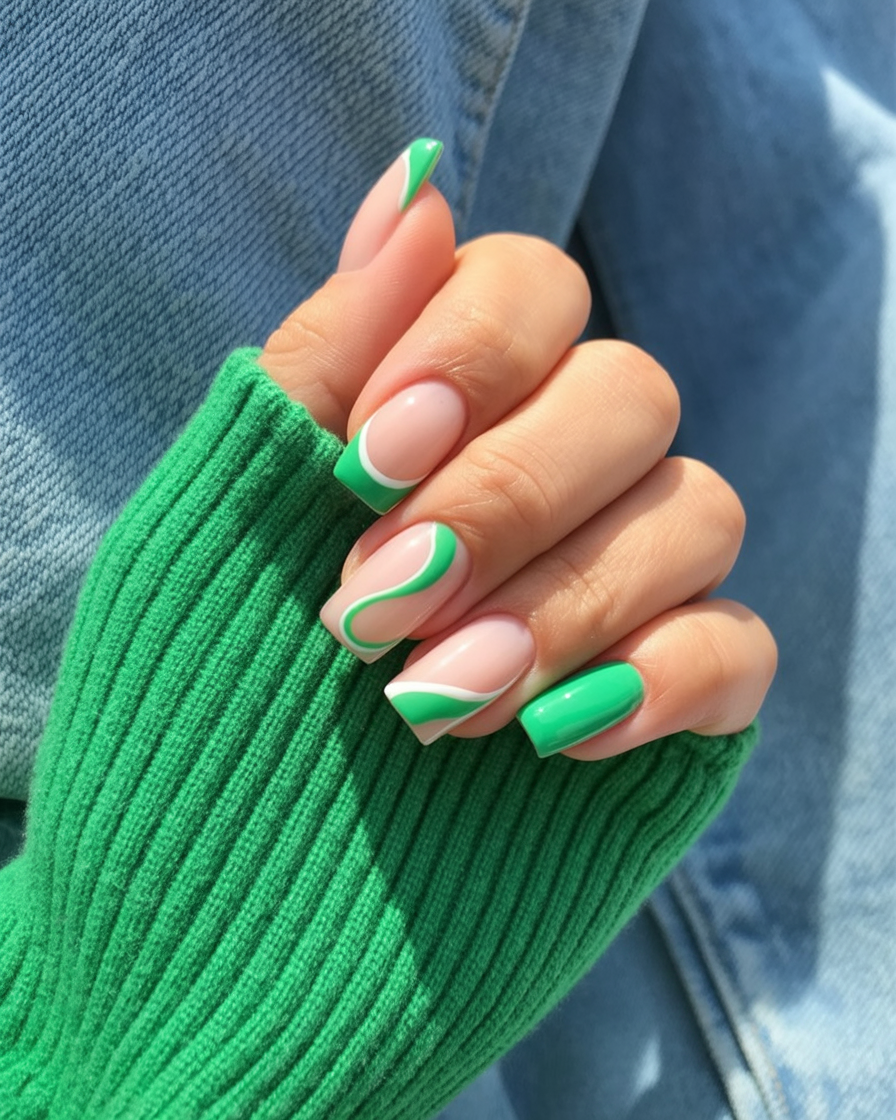These nails feel expressive and confident, like wearing your favorite bold ring that always sparks a compliment. The mix of solid green with soft, flowing swirls creates movement and depth, giving the manicure an artistic edge without feeling overwhelming. It’s modern, stylish, and full of personality—perfect if you like your nails to make a subtle statement.