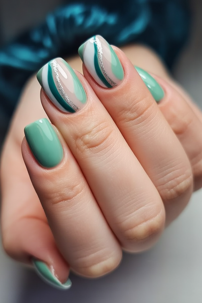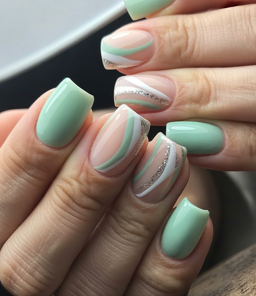 This manicure feels soft, graceful, and quietly sophisticated. The blend of nude and mint tones flows gently across the nails, while the thin silver accent adds a subtle sparkle that catches the light in the prettiest way. It’s the kind of look that feels calm and confident, perfect for welcoming spring with a sense of ease and elegance.