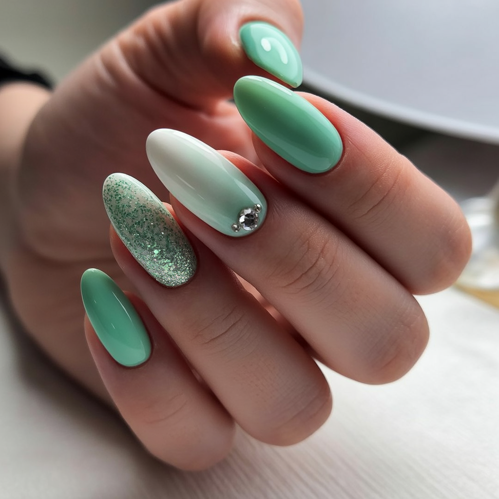 These nails feel playful yet polished, like a fresh manicure that instantly lifts your mood. The mix of mint shades adds interest without overwhelming, and the tiny crystal detail brings just the right amount of sparkle. It’s cheerful, fresh, and undeniably cute.