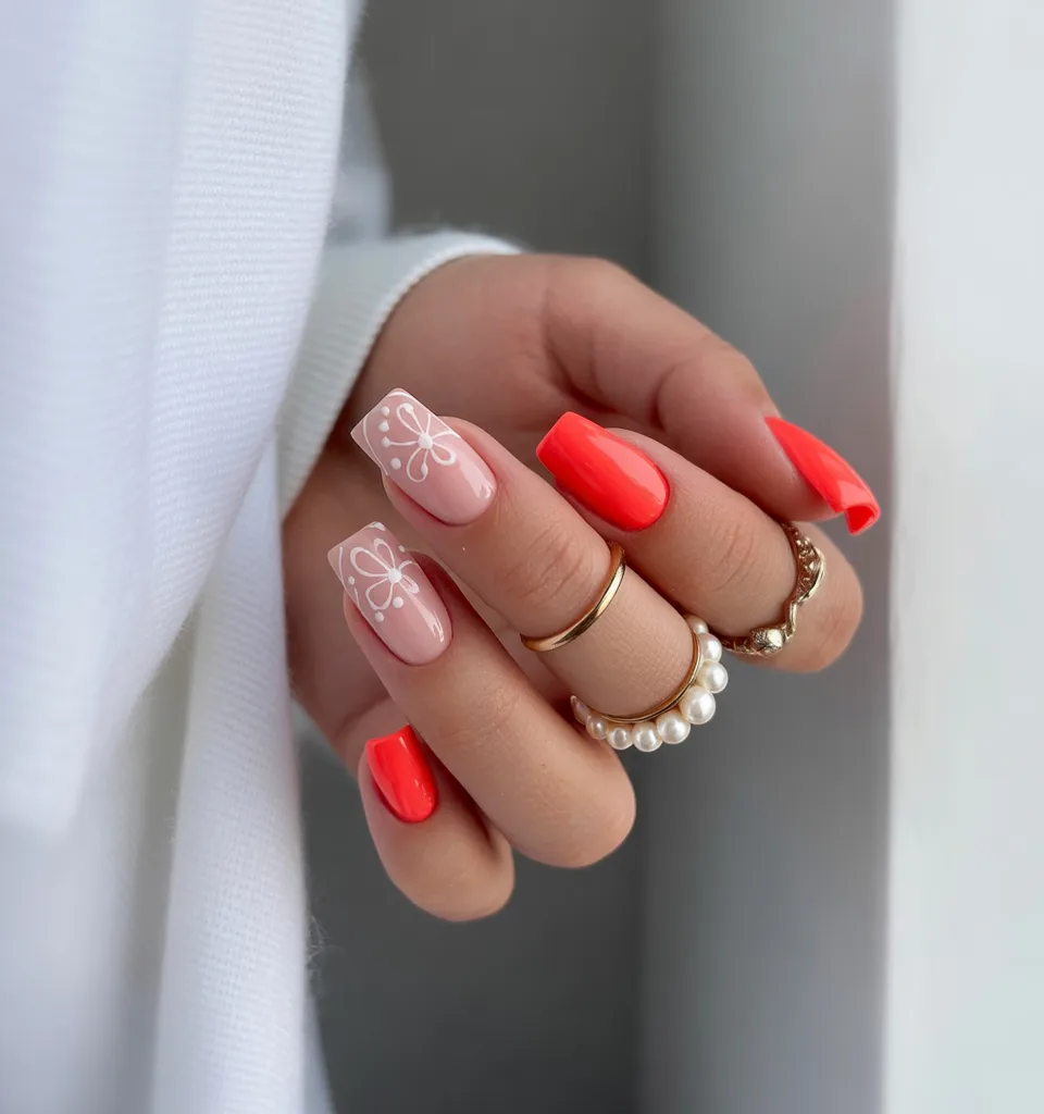 This one is pure energy. The bright coral nails instantly draw the eye, while the sheer pink base with white floral Design keeps it feeling fresh and modern. It’s bold, yes—but balanced. Think statement handbag meets classic tailoring.