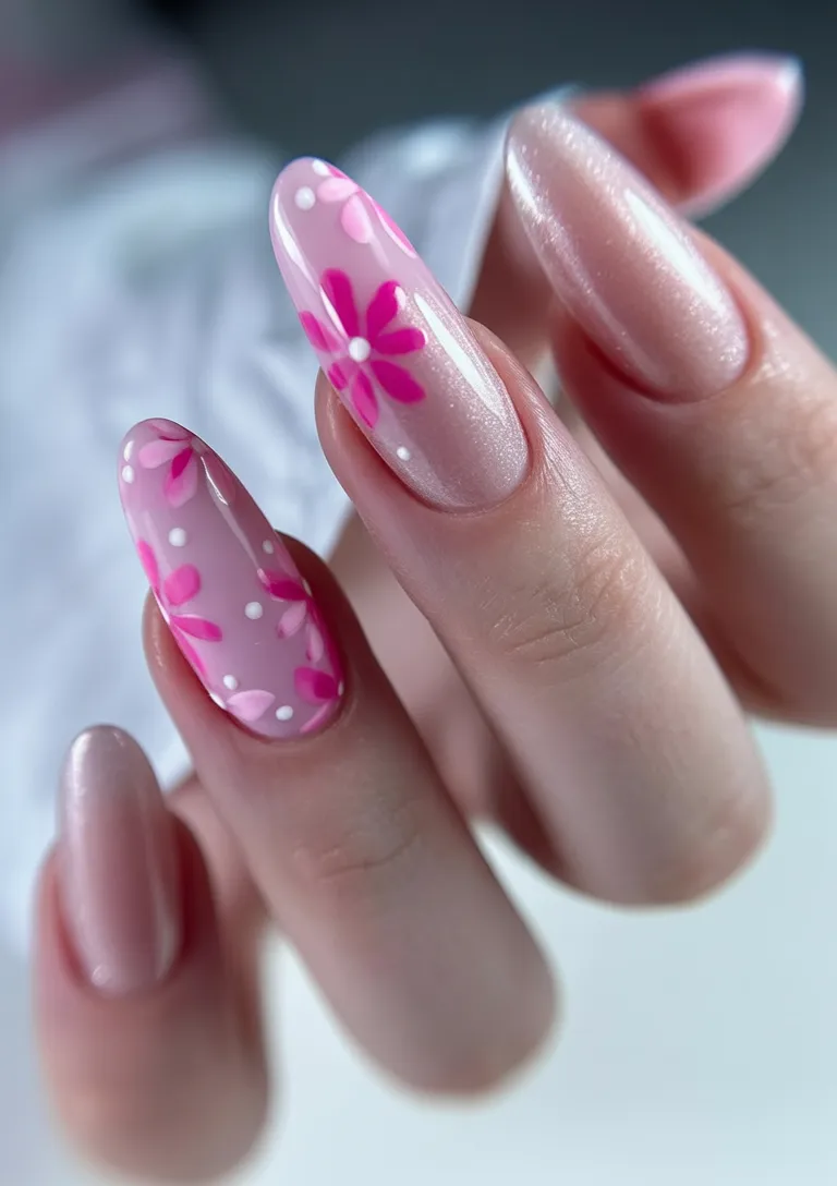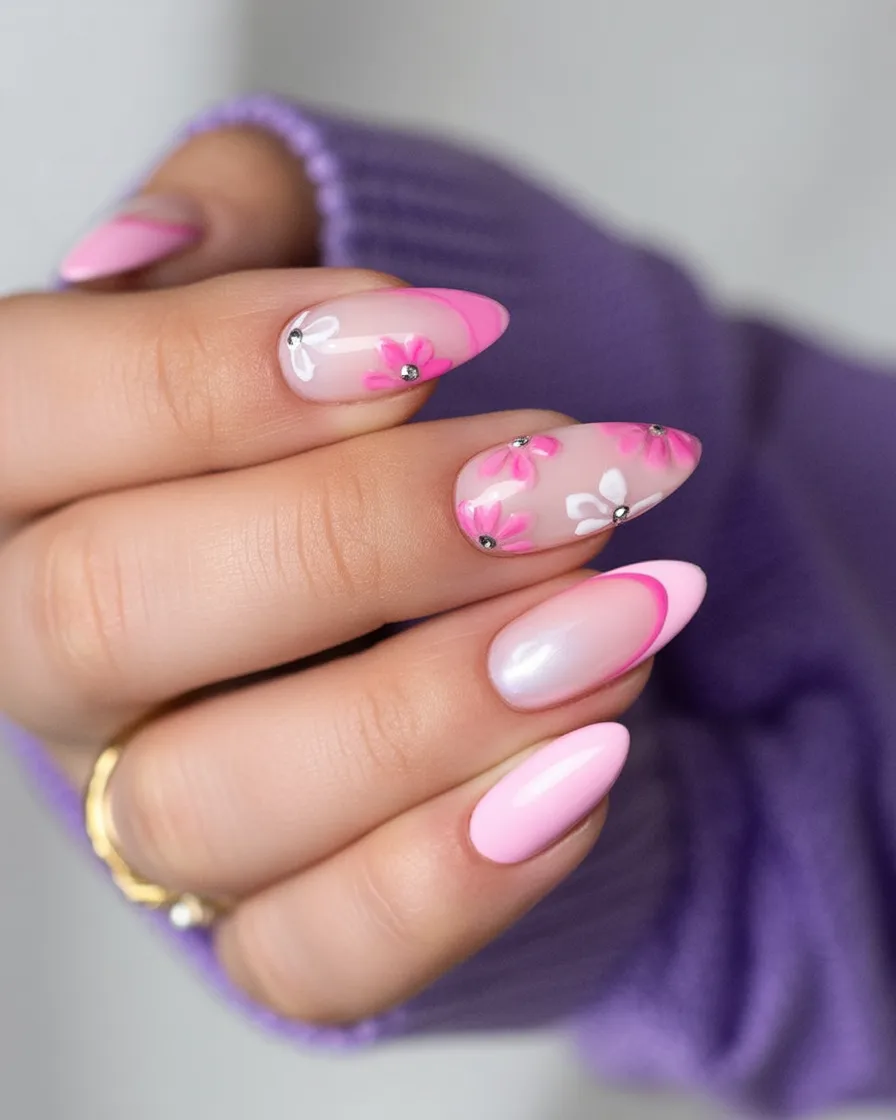 If you want ideas that are light and uplifting, this one really is a winner. The pastel colors are trending in 2026, but the simple floral design keeps it timeless. It especially complements medium almond nails and goes really well with dainty jewelry and glowy skin.