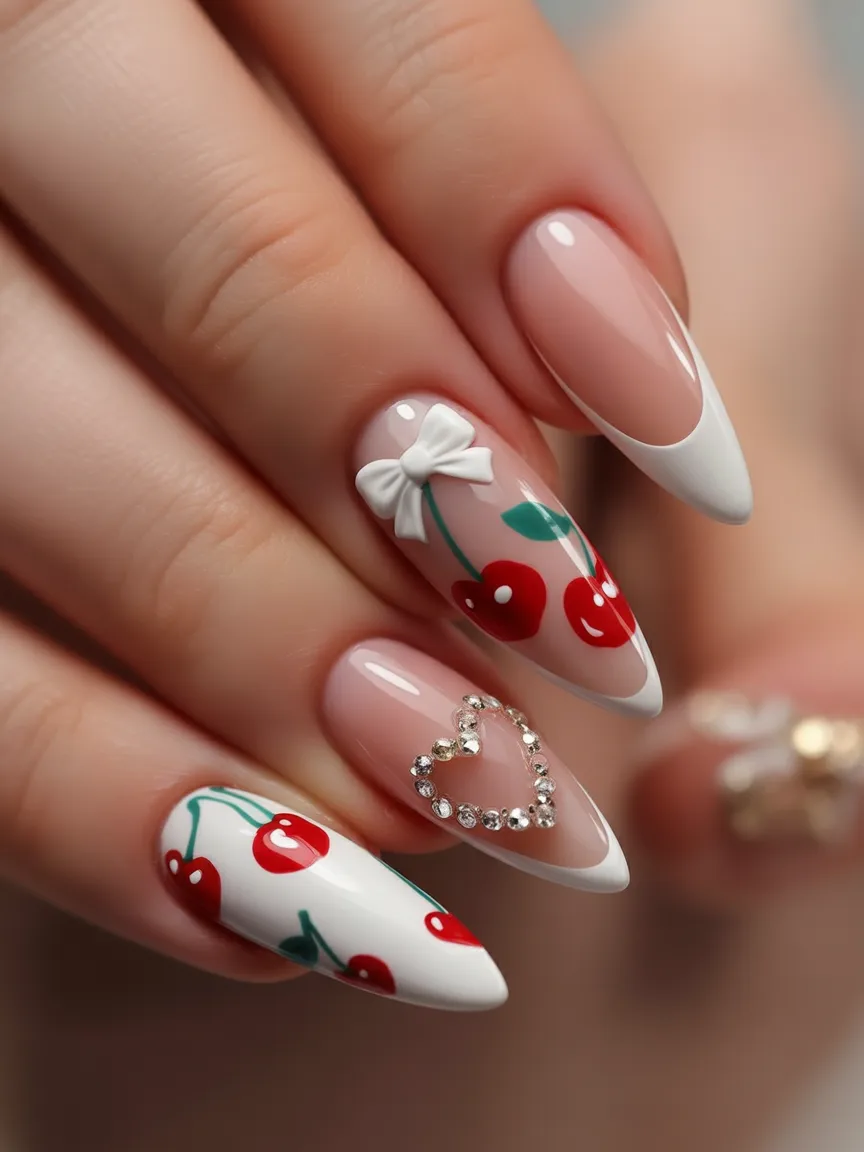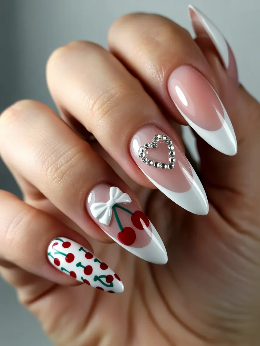 This is classic ideas french tip with flirty twist. Crisp white tips frame the almond shape beautifully, while the cherry Art and rhinestone heart bring personality and sparkle. It’s playful, a little nostalgic, and totally charming without feeling over-the-top.
