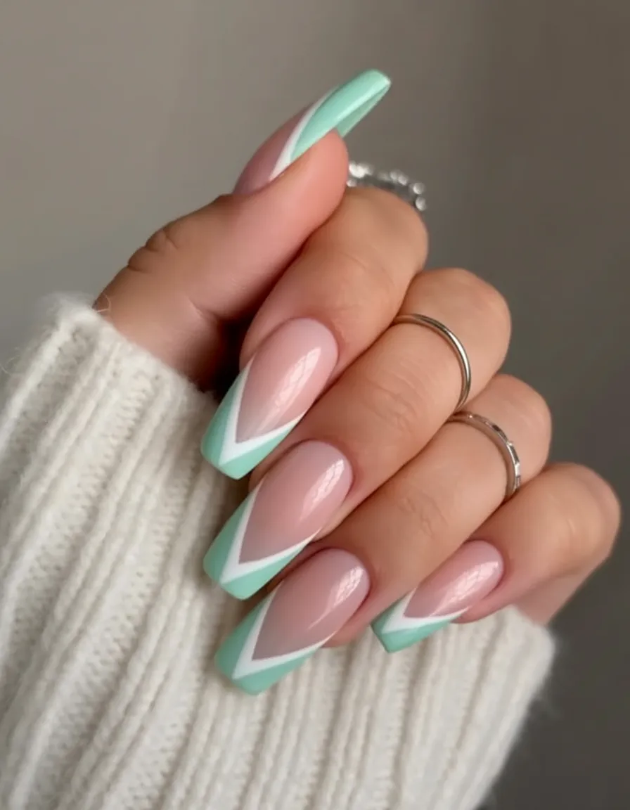 This mint V-tip French square set is a fashionable ensemble with a crisp and clean finish. The sharp mint and white color combination produces a modern touch with their contrasting V lines, achieving the perfect balance between a feminine touch and an edginess.