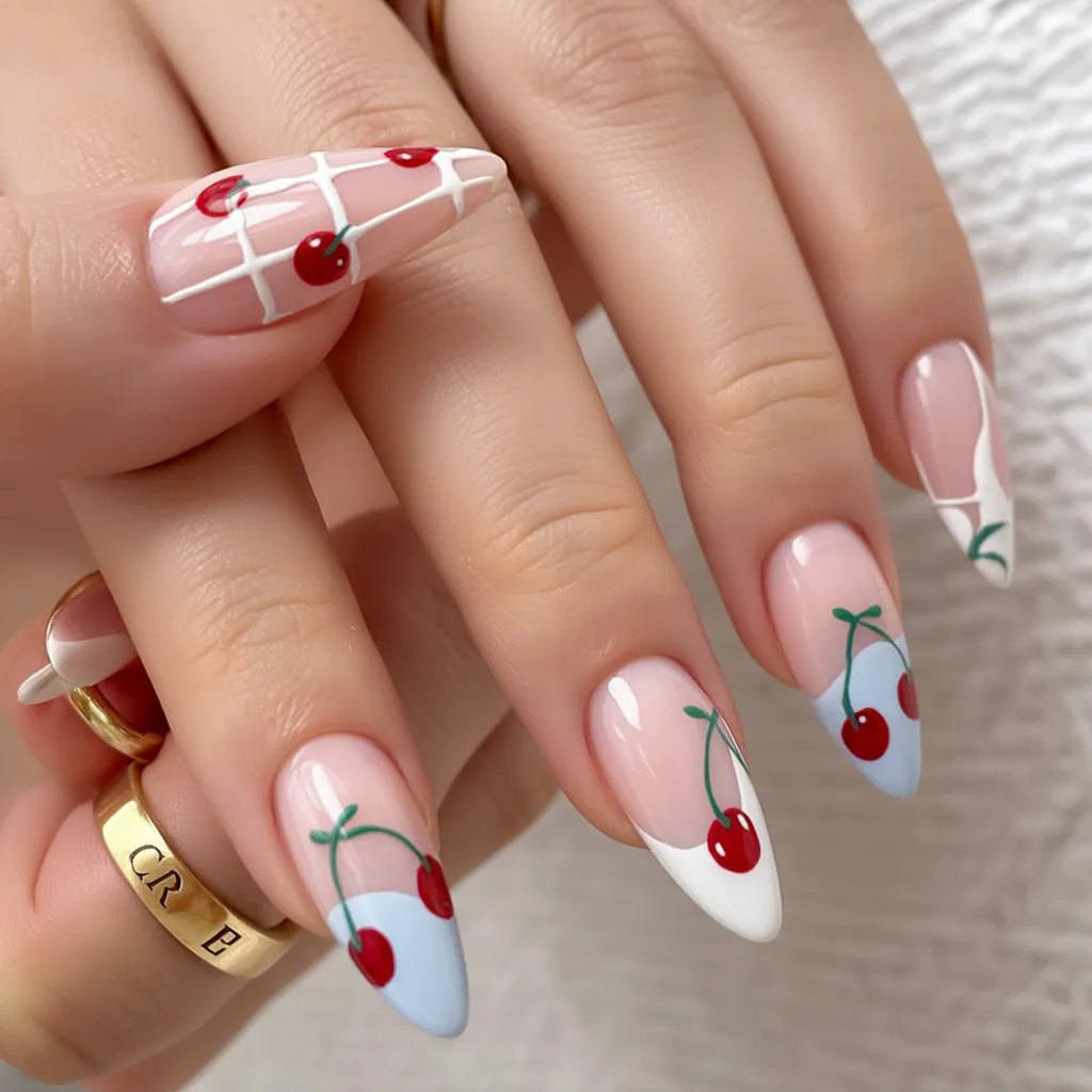 There’s a fresh, almost retro charm to this look. The soft blue french edge mixed with tiny cherries feels like vintage picnic vibes but done in a totally modern way. It’s lighthearted without being childish, and that almond shape keeps everything elegant and elongated.