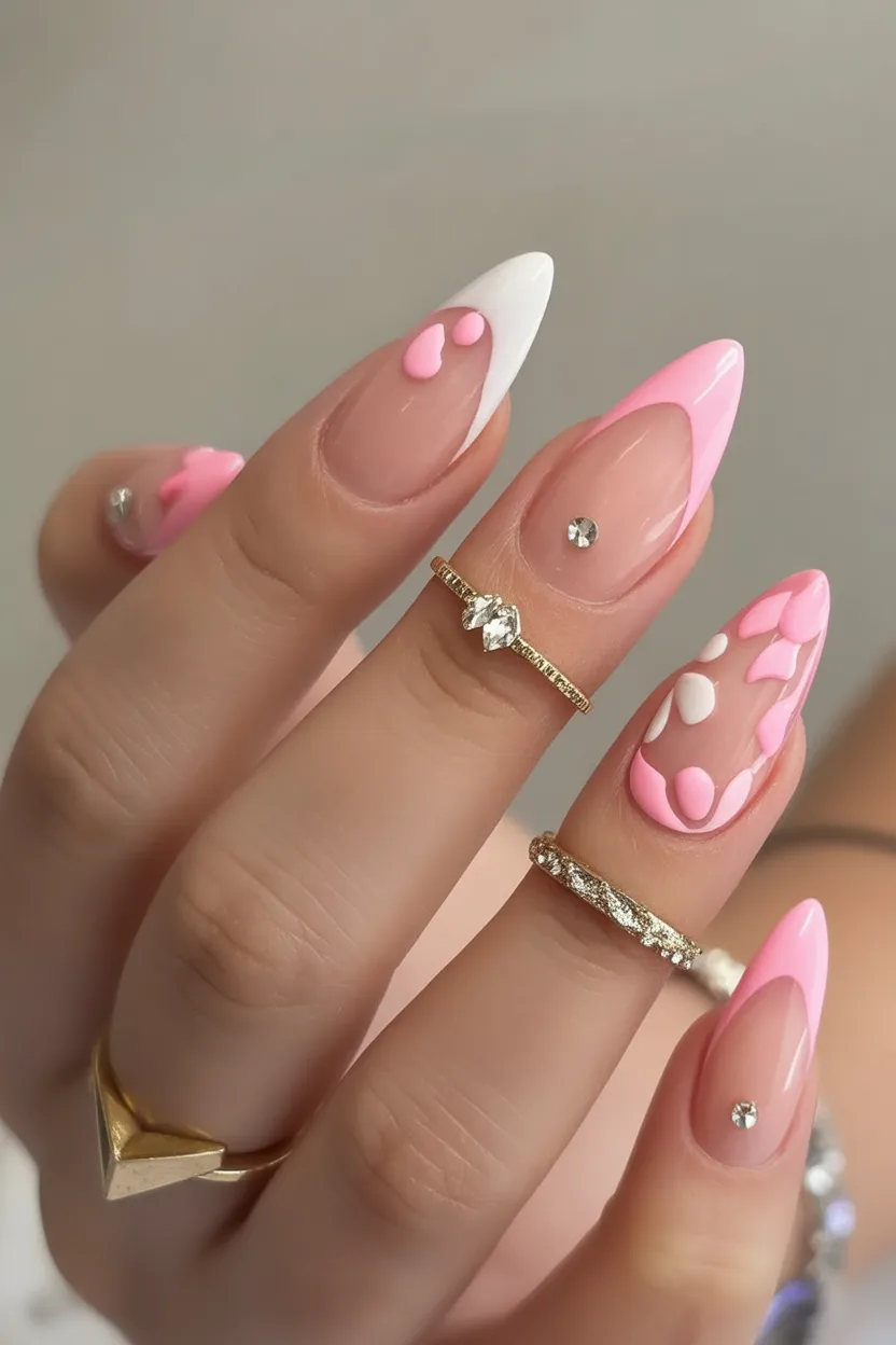 6. Pink & White Almond with Minimal Gems