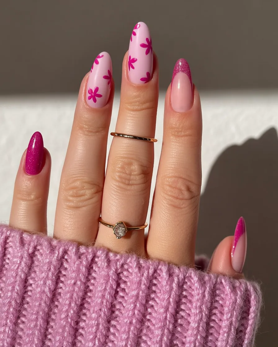 If you’ve been waiting for an excuse to go bold, this is it. The mix of hot pink glitter, soft blush, and playful floral accents feels joyful and unapologetically feminine. It’s vibrant without feeling chaotic—everything works together in that sweet spot between fun and polished.