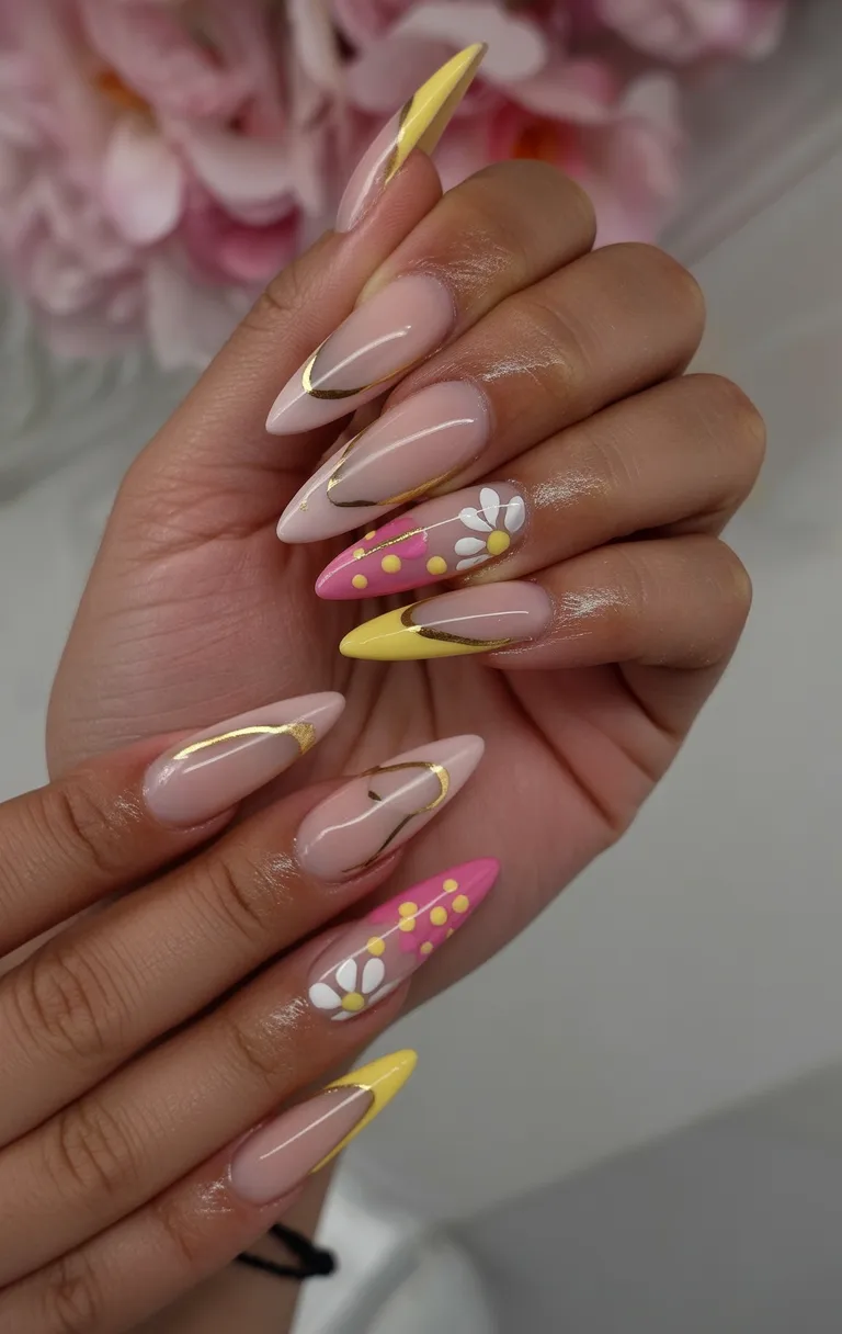 If you love almond-flavored Ideas that feel elevated, this one is special. The slim gold accents elongate the nail even more, while the cheerful Colors keep it fresh. These almond designs are ideal for vacations, garden parties, or anytime you want spring ideas that feel both luxurious and fun.